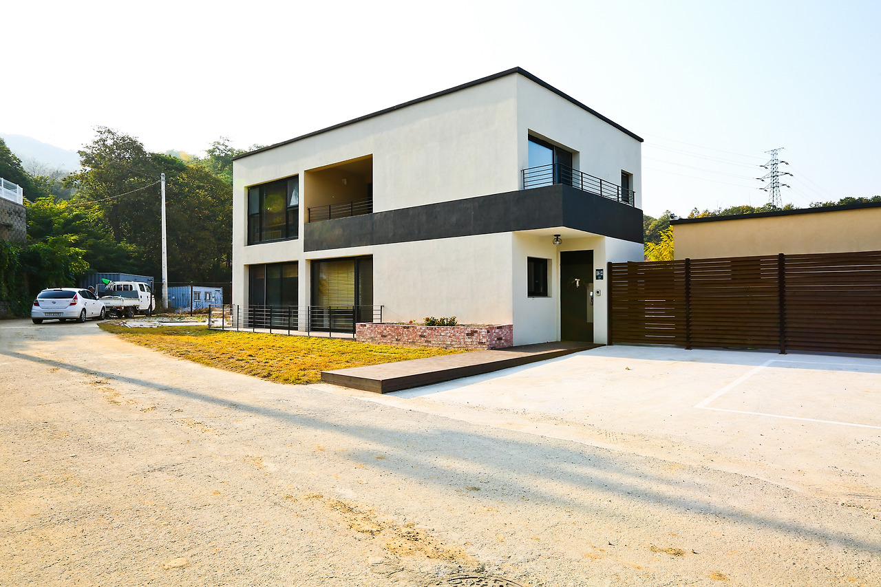 이 주택은 주택 단지에 시공된 네모 반듯한 모습인데요, 이 주택은 주차공간이 확보되어 있으며 1층에는 프라이빗한 마당이 자리하고 있습니다. 이 용인 전원주택 또한 문의가 굉장히 많았었던 사례인데요, 한 눈에 보아도 우리 가족만의 공간이라는 것이 느껴지면서 주차공간, 프라이빗한 마당, 안정감이 느껴지는 외관 때문이 아닐까요?