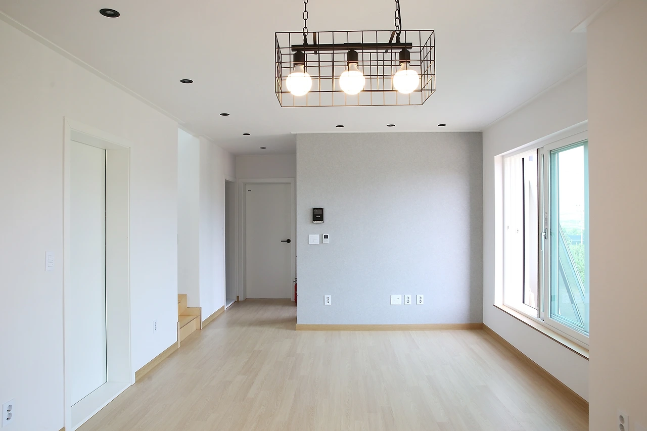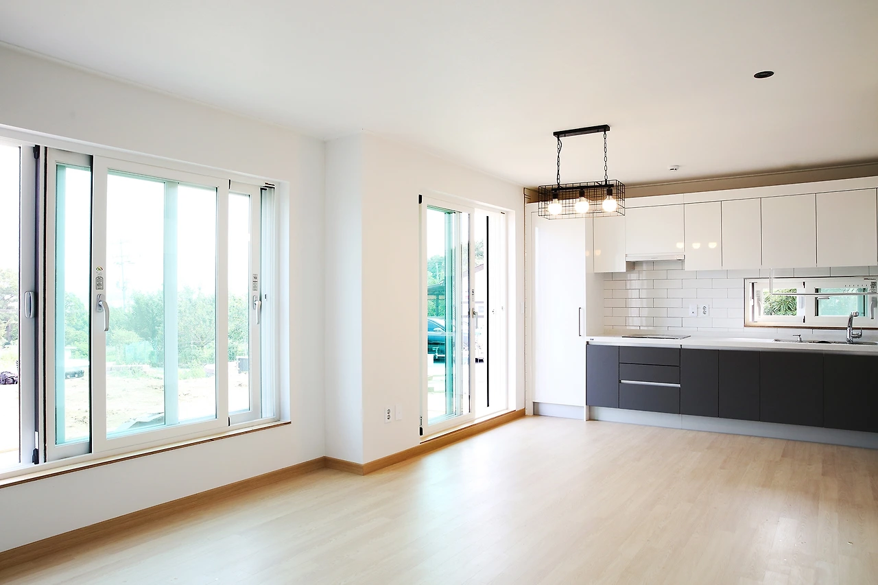 채광이 잘 드는 주방과 거실의 모습입니다. 동선을 고려하여 해당 공간은 일직선으로 시공하였는데요, 해당 공간에서는 가족들과의 커뮤니케이션이 원활할 수 있겠지요. 또한, 주방에서는 마당과 바로 연결되는 창호가 있어 동선에 굉장히 유리하도록 시공하였습니다.