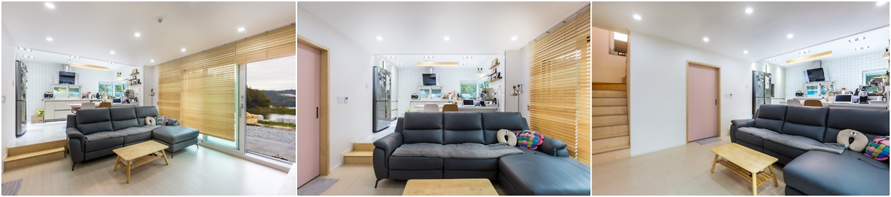 현관에 들어가면 복도를 중심으로 모든 공간이 일직선으로 이어지도록 설계하였습니다. 거실과 마당을 연결하는 큰 창을 가진 전남 전원주택. 거실의 창 너머로 보이는 푸른 강이 캠핑을 온 것만 같은 탁 트인 전경을 자랑합니다.