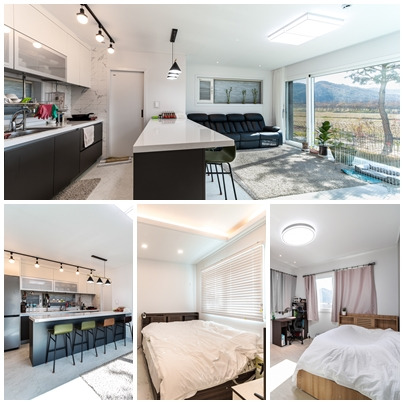 주택 앞의 전원 풍경을 한눈에 감상할 수 있으며 반짝이는 햇살을 집 안 가득히 드리웁니다.