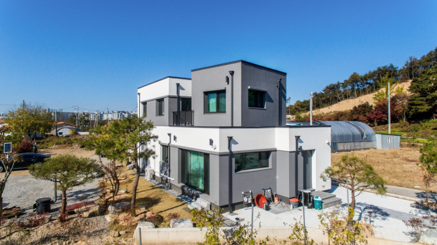 주택을 둘러싼 소담한 나무들과 넓게 펼쳐진 자연풍경이 함께해 모던한 색채를 지닌 주택임에도 불구하고, 오목조목한 아름다움이 함께합니다.