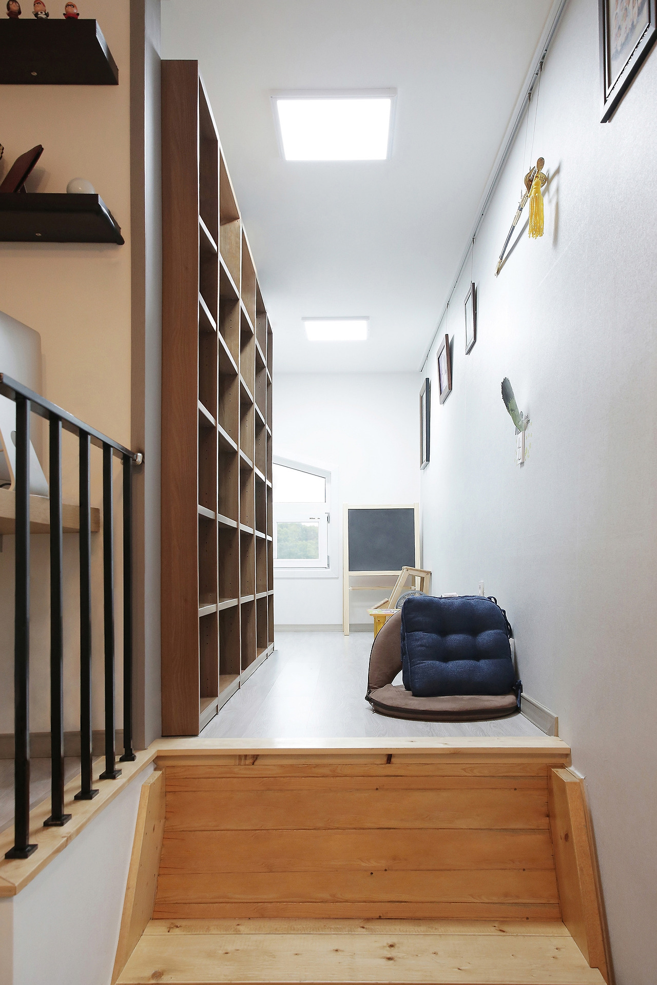 이 공간은 책장 겸 수납을 할 수 있는 이 공간은 아늑하면서도 공간 활용이 잘 된 사례입니다. 스킵플로어로 시공된 이 공간은 전원주택에서만 누릴 수 있답니다.