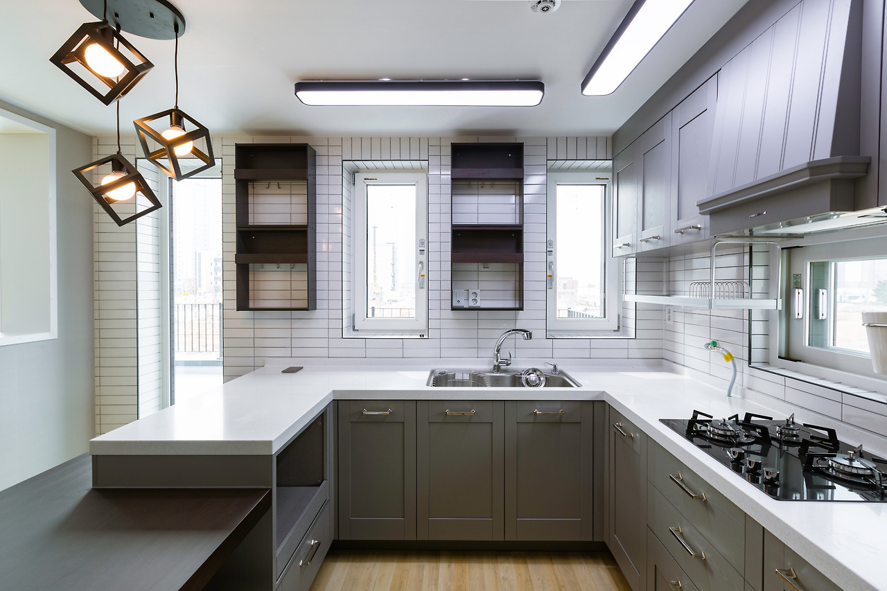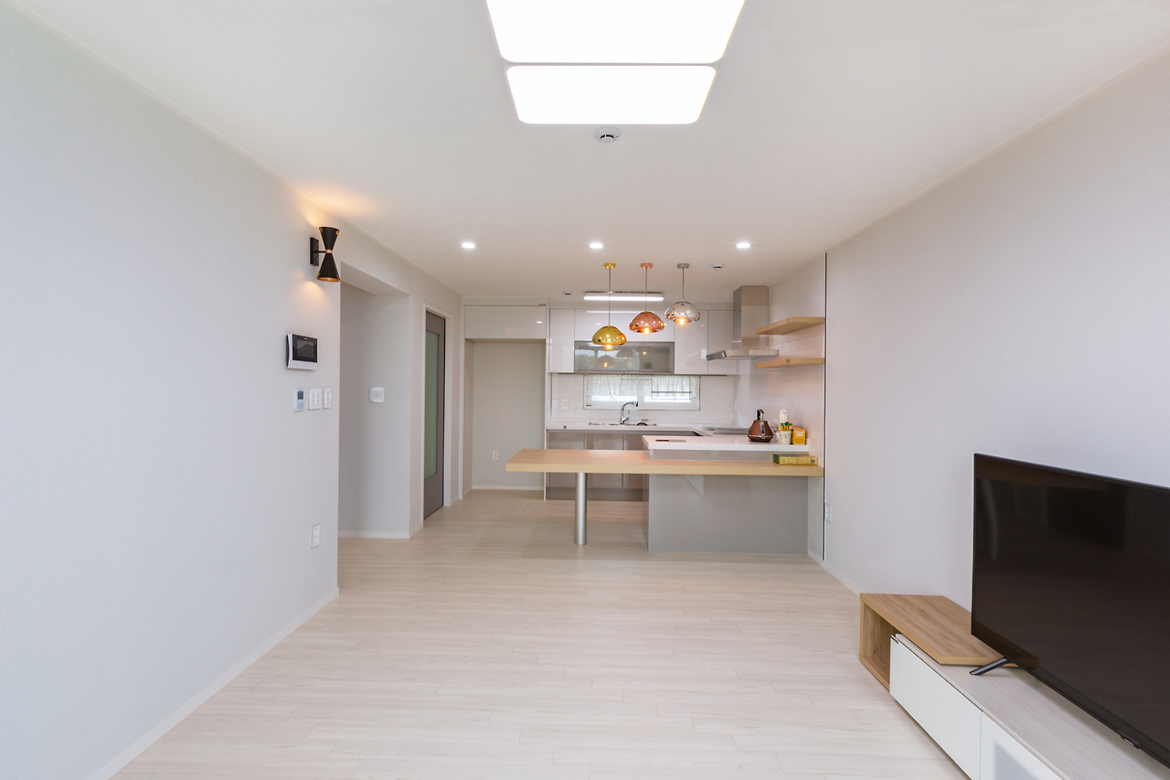 온 가족들이 함께할 수 있는 공간인 주방/거실이라는 특징을 살린 이 구조는 쉽게 찾아볼 수 있는 만큼, 많은 분들이 선호하시는데요! 거실쪽에 있는 큰 창호를 통해 주방까지 채광이 스미는 것이 느껴지지 않나요?