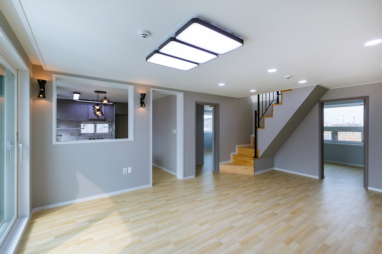 앞서 보셨던 한글주택의 완공 예시처럼 거실과 주방이 완전히 분리가 되어있는 형태지만 별도의 벽으로 분리를 한 것이 아닌 완벽히 공간자체가 나누어져 있으며, 거실과 주방의 사이를 연결해주는 복도와 계단실이 자리하고 있습니다.
