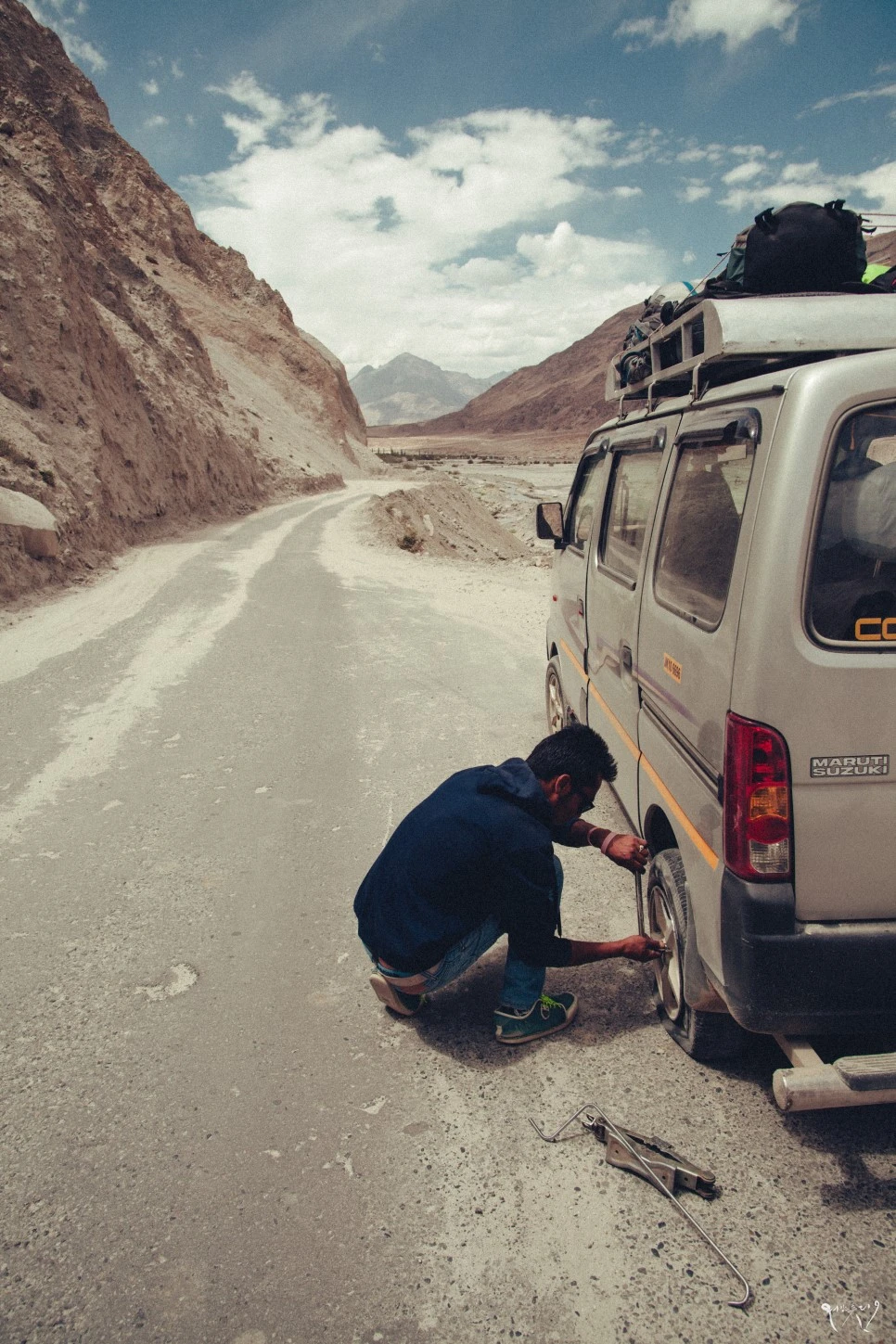 카르동라를 내려오는 길에 갑자기 펑소리가 났다. 대충 들어도 뭔가 터지는 소리다. 아니나 다를까 타이어가 터져서 주저 앉아버렸다. 보통 빵꾸가 나면 조금씩 바람이 빠지기 마련인데, 이 타이어는 한 번에 터져버렸다. 스페어 타이어 상태도 곧 터질 것만 같다. 더 충격적인 건 기사의 표정이 그닥 당황스럽지 않다. 트렁크에서 도구 몇개를 꺼내더니 20분 정도 손을 본 후, 다시 타라는 제스처를 보인다. 불안해하는 우리를 향해 기사는 말했다. 충격이었다.