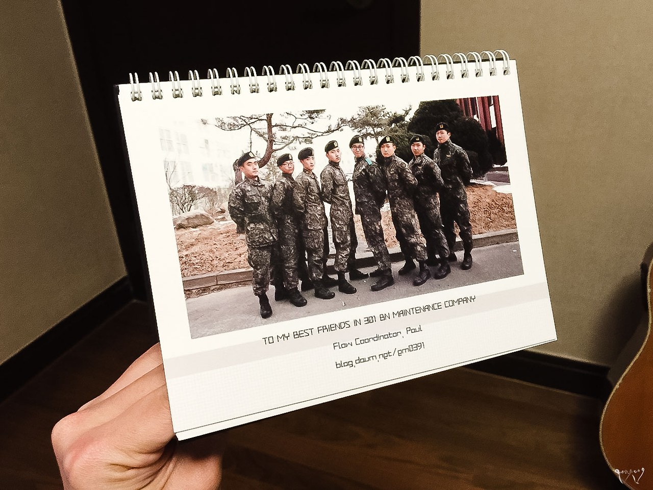 가장 기억에 남는 순간은 전역 전, 함께 지낸 중대원들의 사진을 찍어 각자의 전역일이 기록된 맞춤달력을 선물했을 때다. 대부분 전역을 할 때면, 중대원들이 전역 축하선물을 해준다고 하는데, 나는 오히려 내가 선물을 해주고 싶었다. 당시 나의 마지막 병장월급은 15만원. 이 돈으로 무엇을 할까 고민을 하다가, 중대원들의 사진으로 특별한 달력을 만들어 주기로 결심했다. 부대 내에서는 특별한 허가가 있지 않으면 사진을 찍을 수 없었기 때문에, 사진을 찍으려면 교회를 나가야 했다. 말년 휴가를 나가기 전, 나는 중대원들을 교회로 초대하여 사진을 찍어주었고, 휴가 중 찍은 사진들로 직접 디자인해 달력으로 제작했다.