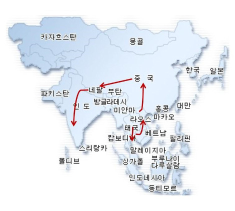 여정: 태국(방콕) - 캄보디아(씨엠립) - 라오스(돈뎃-방비엥-루앙푸라방) - 중국 (쿤밍-따리-리장-샹그릴라-리장-션전-쿤밍) - 네팔(카트만두-치트완-포카라 (안나푸르나)) - 인도 (고락뿌르- 바라나시- 아그라-조드뿌르-자이살메르-우다이쁘르-디우-고아-델리)