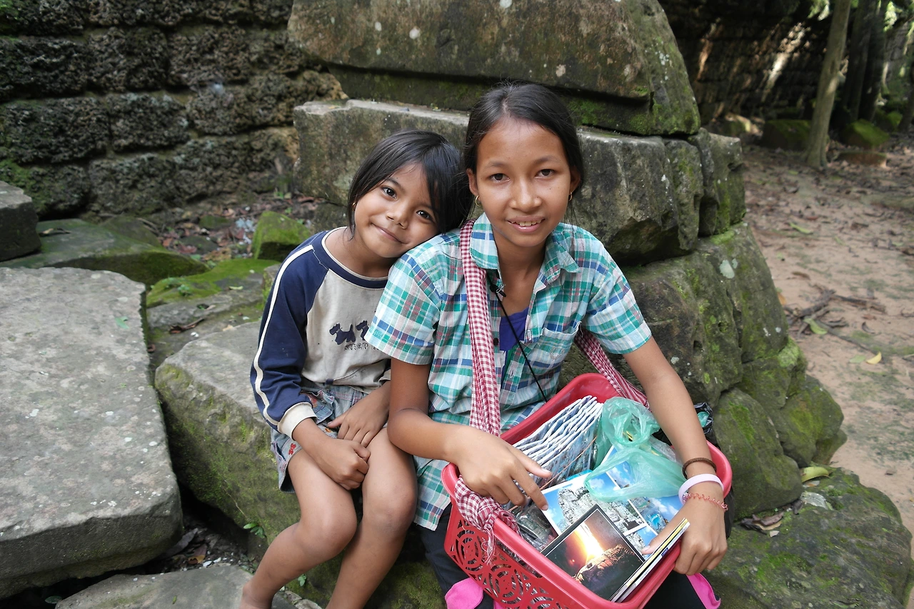 앙코르 유적을 다니다 보면, 너무나 자주 기념품을 파는 아이들과 만나게 된다. 엽서나 자석(냉장고에 붙이는 기념품), 팔찌, 스카프 등을 바구니에 담아 천으로 만든 끈으로 어깨에 메고 돌아다니며, "Please, Just 1 dollar. Buy a postcard. 10 pieces.."라고 말하며, 기념품을 하나 사달라고 끈덕지게 조른다. 눈망울이 너무 예쁘고 목소리도 나긋나긋 예쁘고 구슬프다. 하나 사주고 싶은 마음도 종종 생겼으나, 나는 장기 여행자. 여행 중 짐을 줄이고, 불필요한 물건은 절대 사지 않는 것을 원칙으로 삼았다. 물욕 때문에 무언가 사게 되면 무거워진 배낭으로 내 몸만 고달프게 된다는 것을 이동할 때마다 처절하게 느꼈기에 아이들이 안쓰러웠지만 매번 거절했다. 그리고 무엇보다 아이들이 안쓰럽다고 모든 아이들의 물건을 사 줄 수도 없는 법이다.