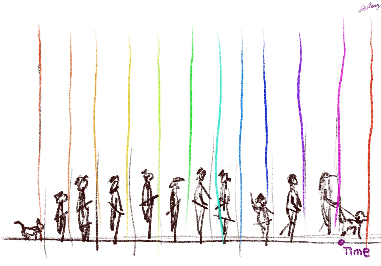 시간과 사람 그리고 삶의 끝 이라는 제목으로 그림을 그려 봤습니다. 우리는 서로 같은 시대에 살고 있지만 서로의 흐르는 시간은 다릅니다. 그리고 서로가 다른 세계를 가지고 있습니다. 한사람이 죽으면 한 세계가 닫힙니다. 그림의 색색의 세로줄은 개인의 세계와 개인만의 시간을 나타내고 있어요.