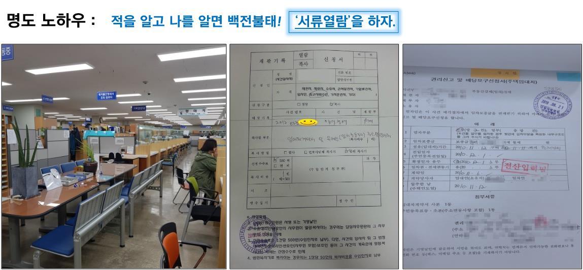 되도록 명도 공략집인 ‘서류 열람’을 하시고 점유자의 아킬레스건을 찾으세요.