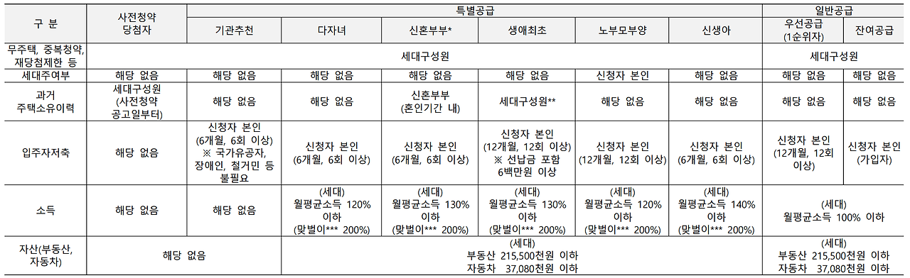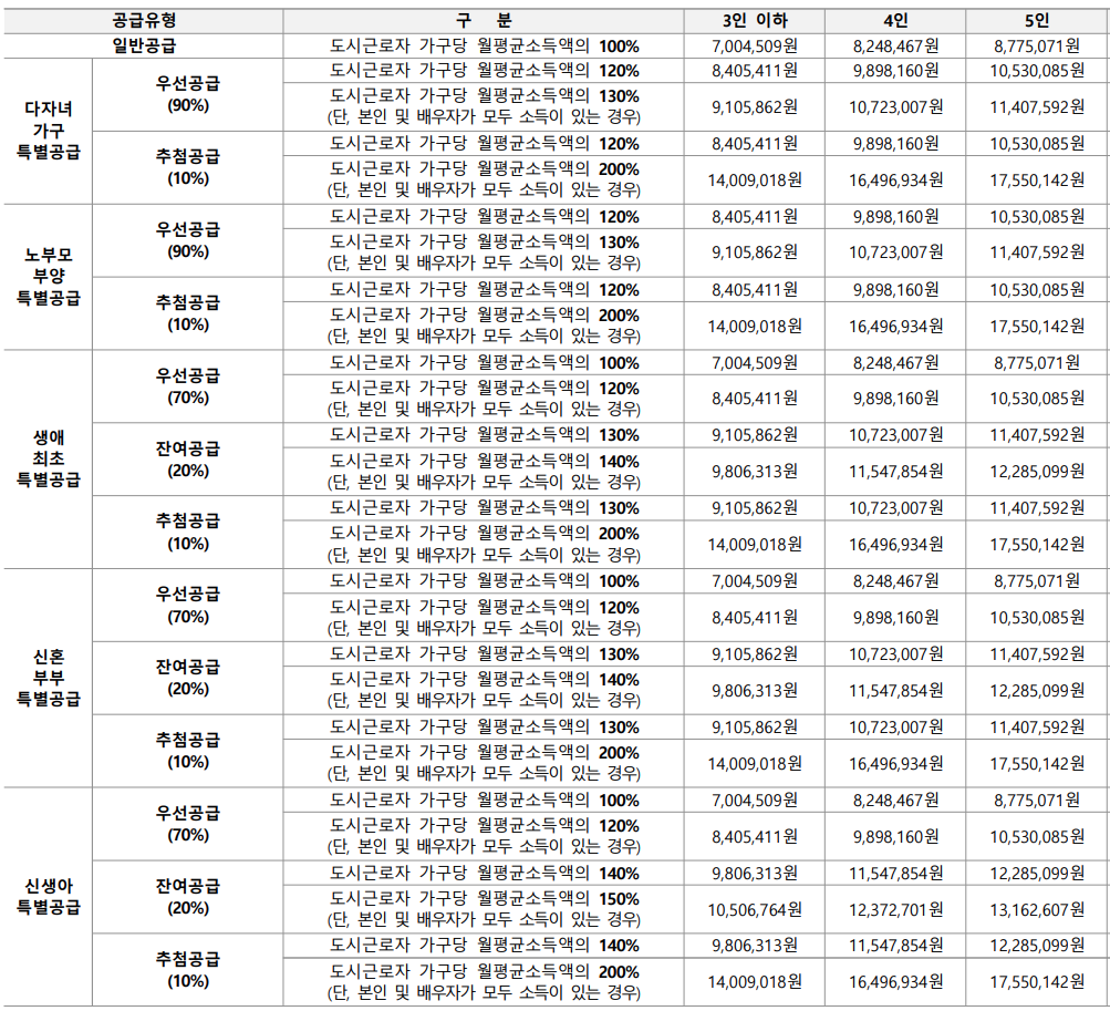 - 일반공급: 전년도 도시근로자 가구당 월평균소득의 100%(분양전환공공임대주택은 가구원 수가 1명인 경우에는 120퍼센트, 2명인 경우에는 110퍼센트)