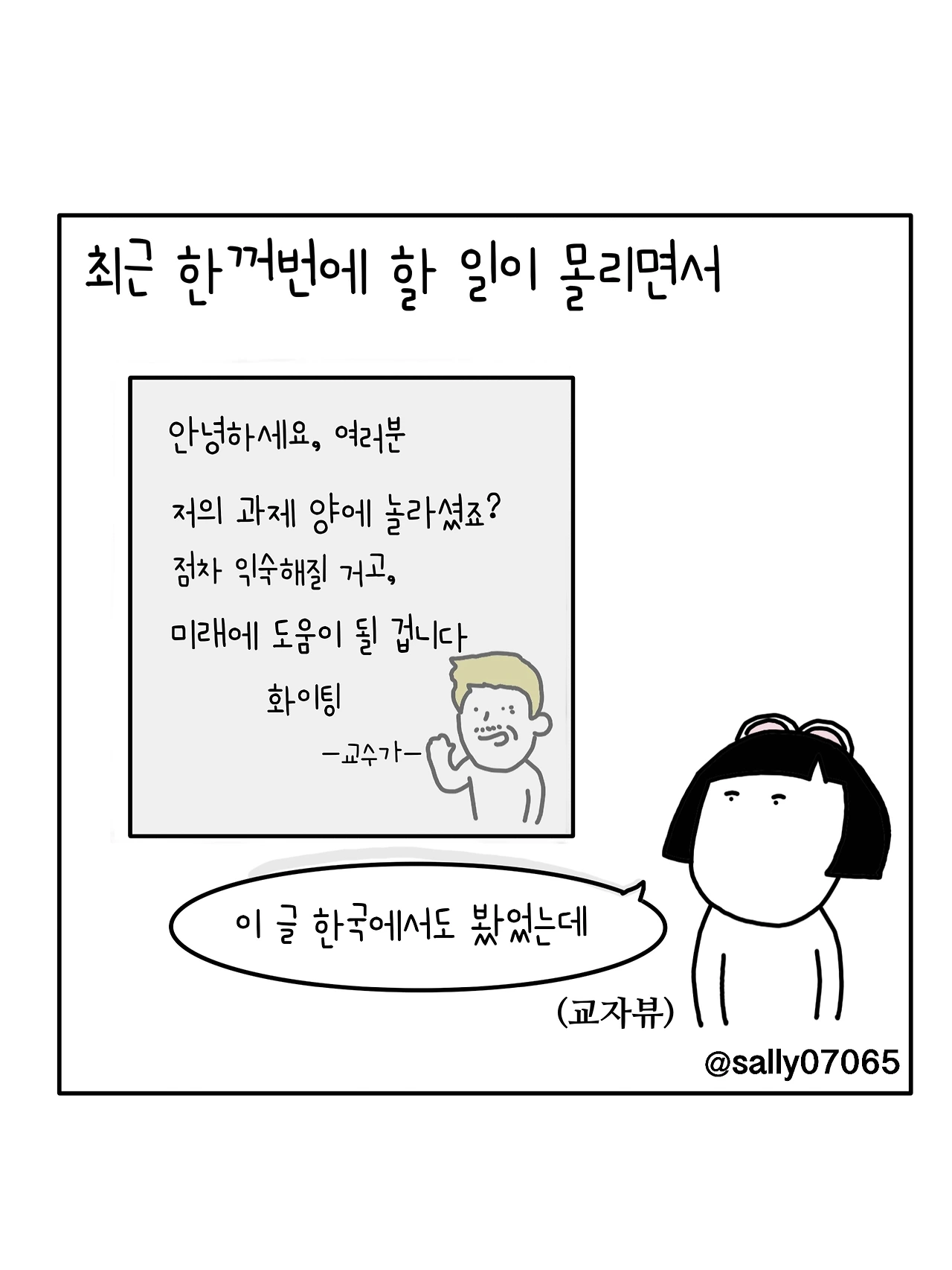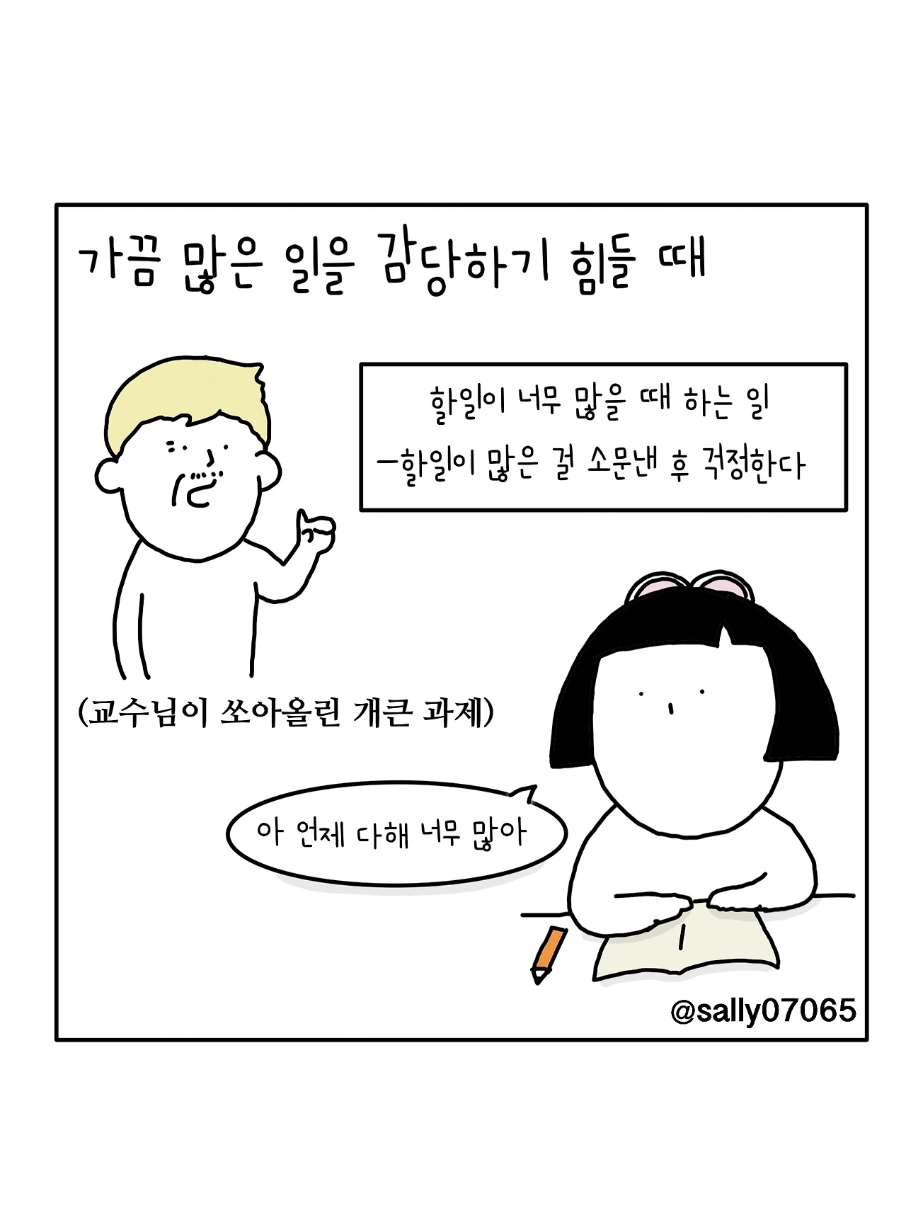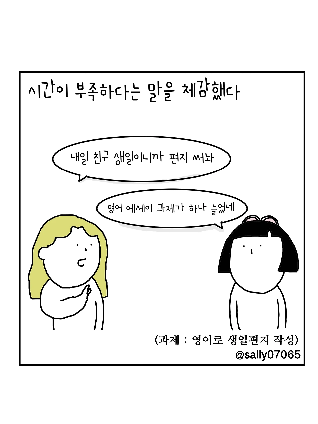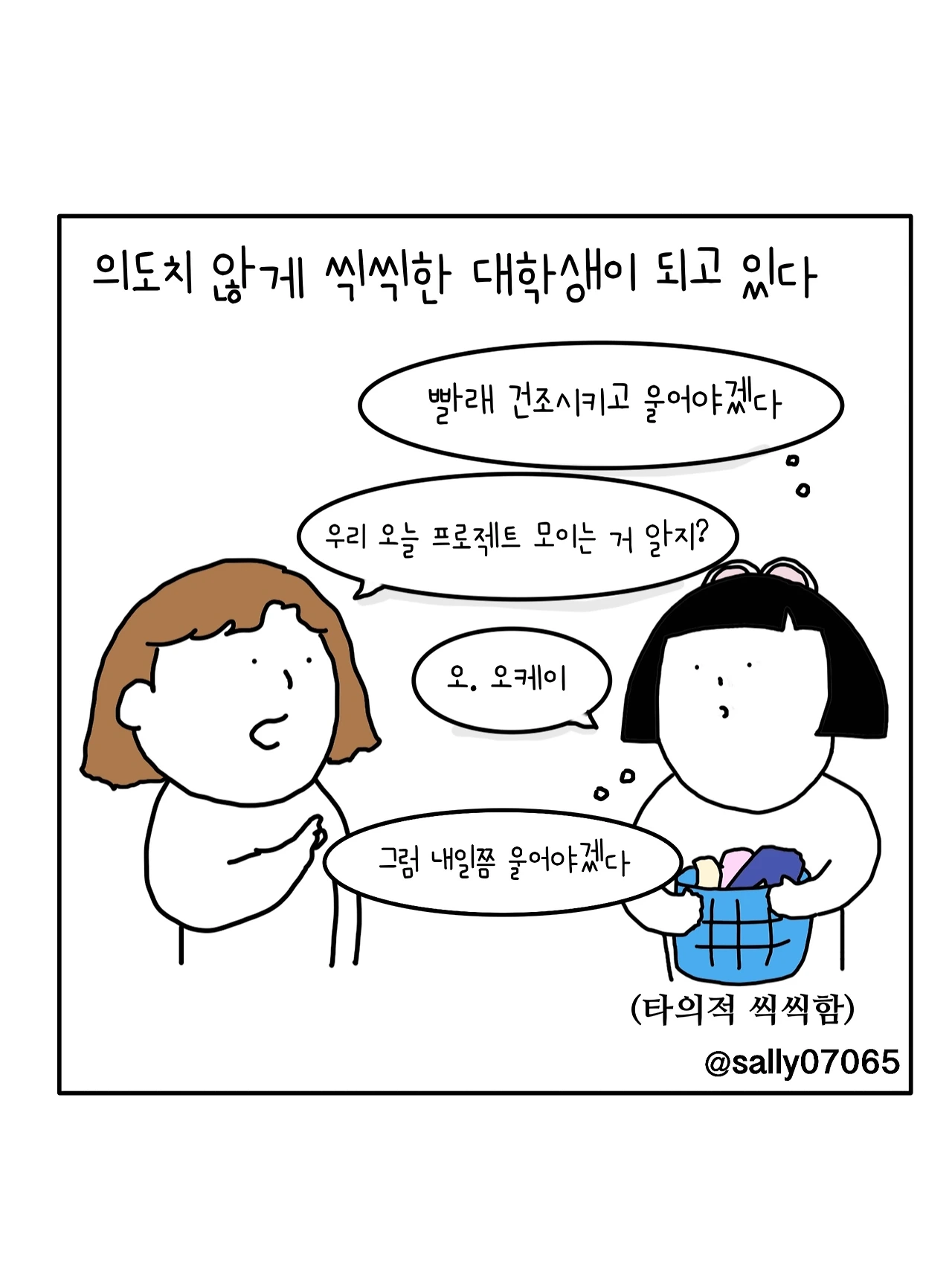 인스타계정sally07065에서 일상툰을 올리며, 블로그운영(밑 url 주소), 책 ‘내향적인 사람 중 가장 외향적인 사람’을 썼습니다