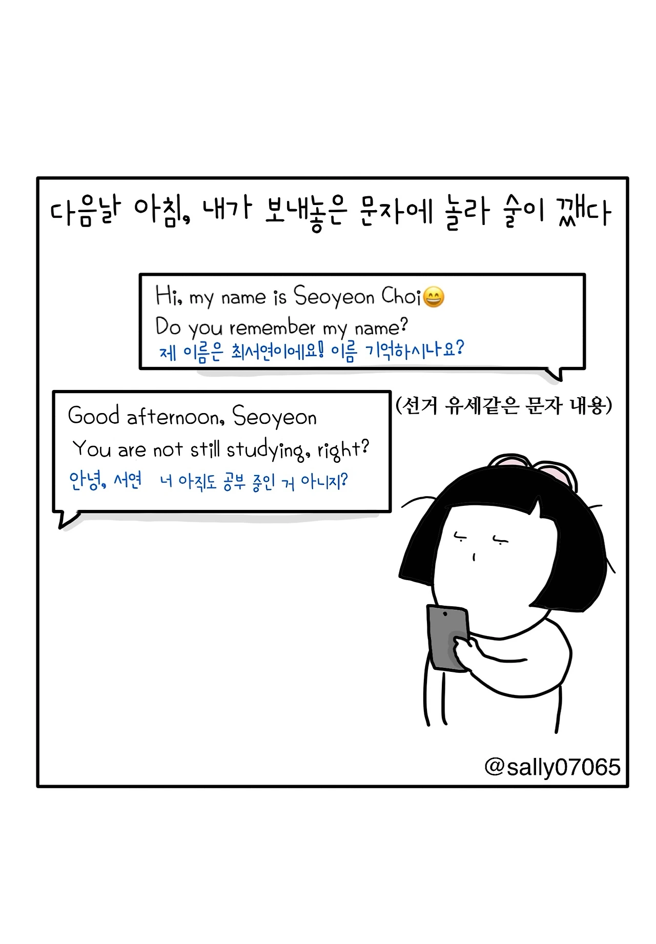 인스타계정sally07065에서 일상툰을 올리며, 블로그운영(밑 url 주소), 책 ‘내향적인 사람 중 가장 외향적인 사람’을 썼습니다