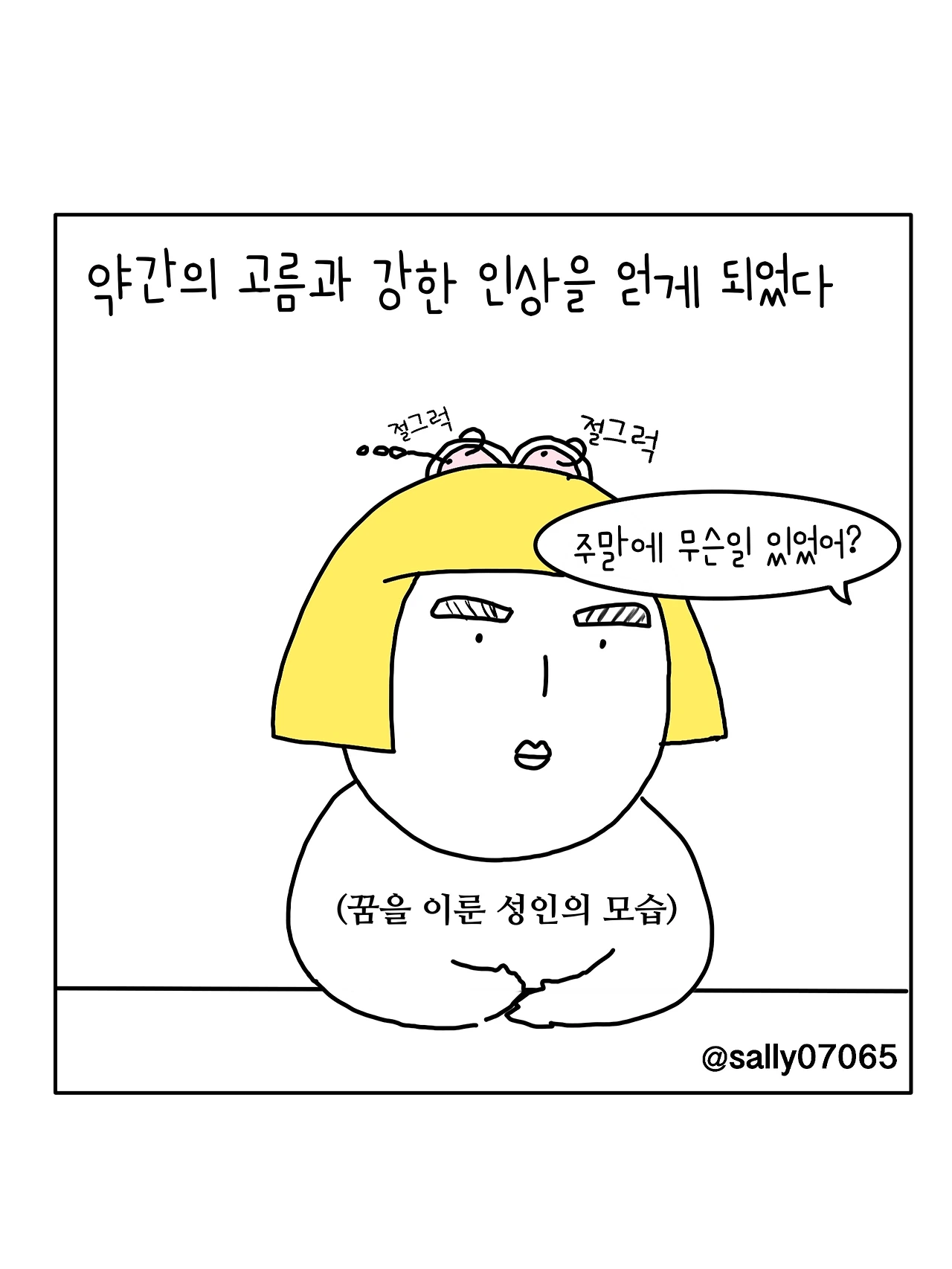 인스타계정sally07065에서 일상툰을 올리며, 블로그운영(밑 url 주소), 책 ‘내향적인 사람 중 가장 외향적인 사람’을 썼습니다