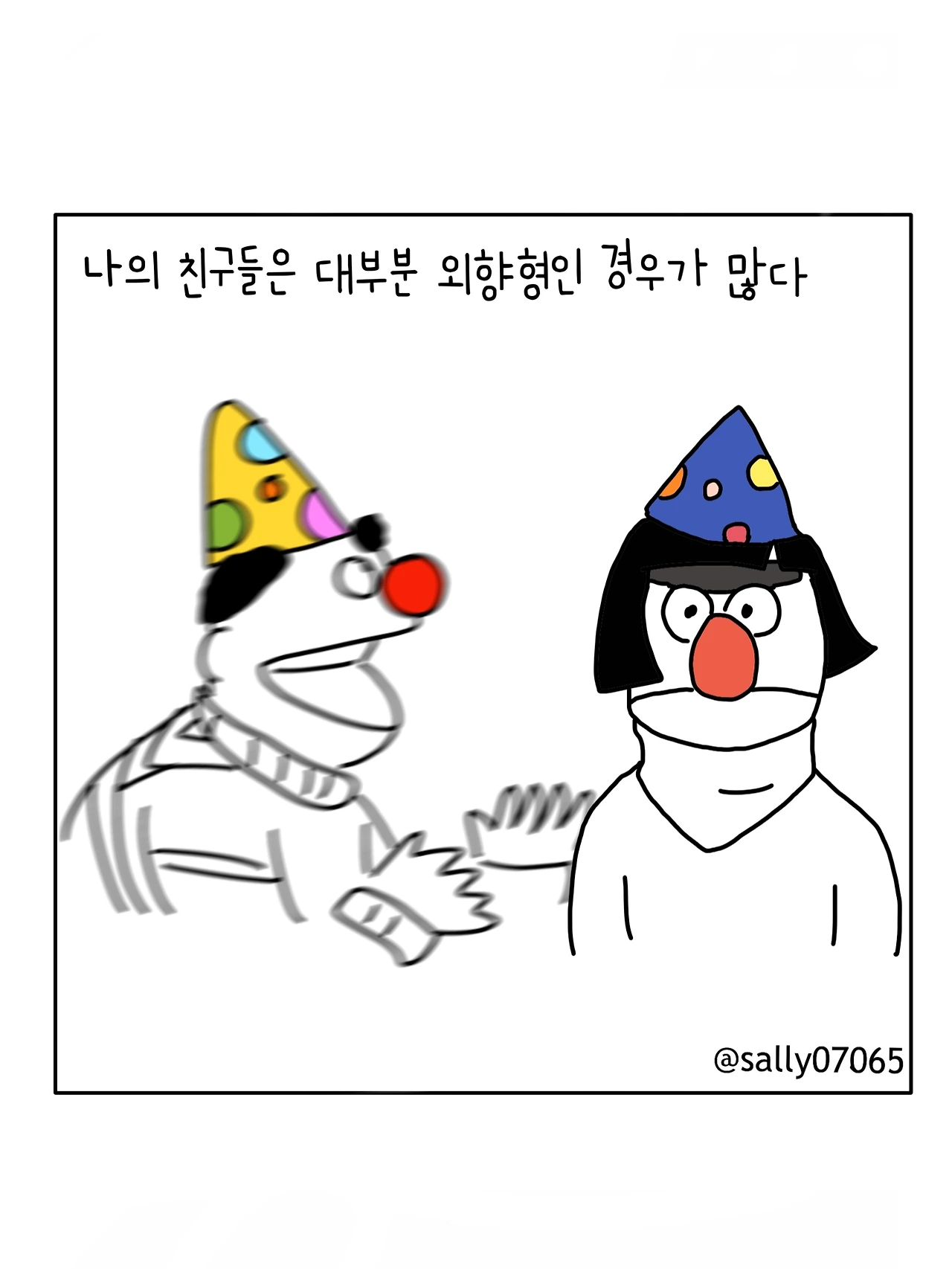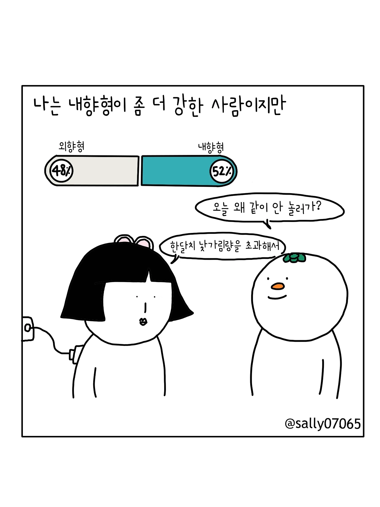 인스타계정sally07065에서 일상툰을 올리며, 블로그운영(밑 url 주소), 책 ‘내향적인 사람 중 가장 외향적인 사람’을 썼습니다
