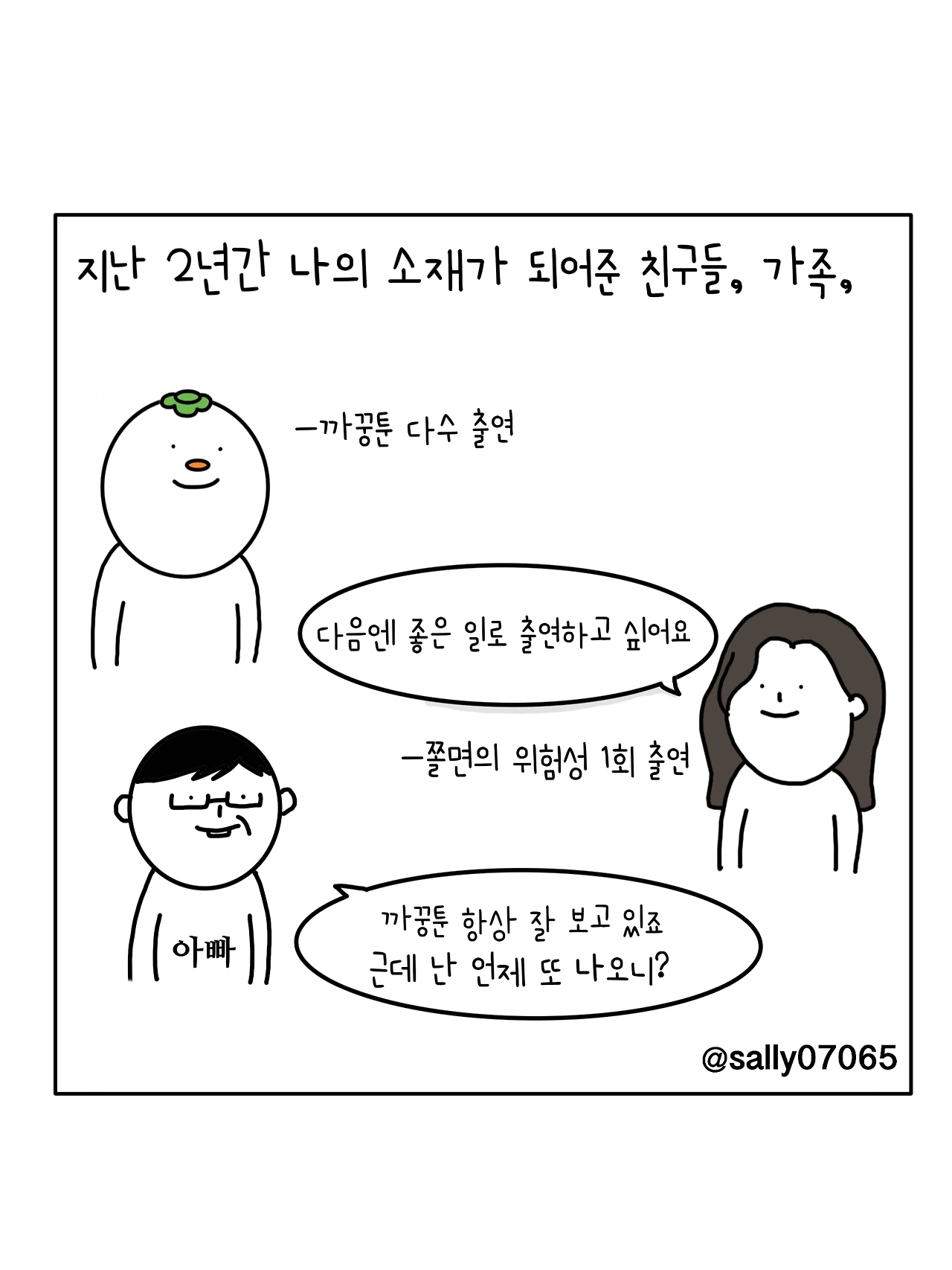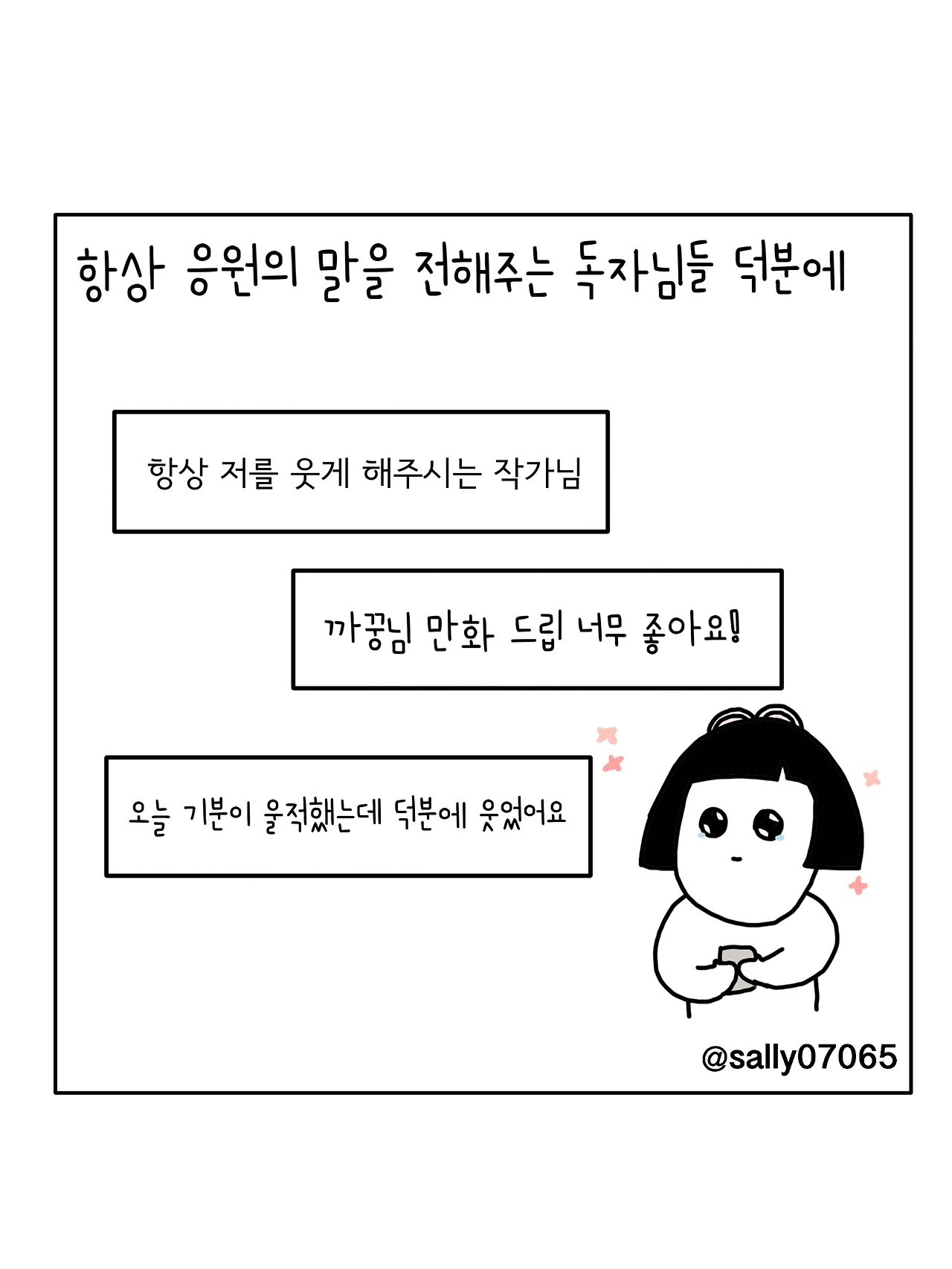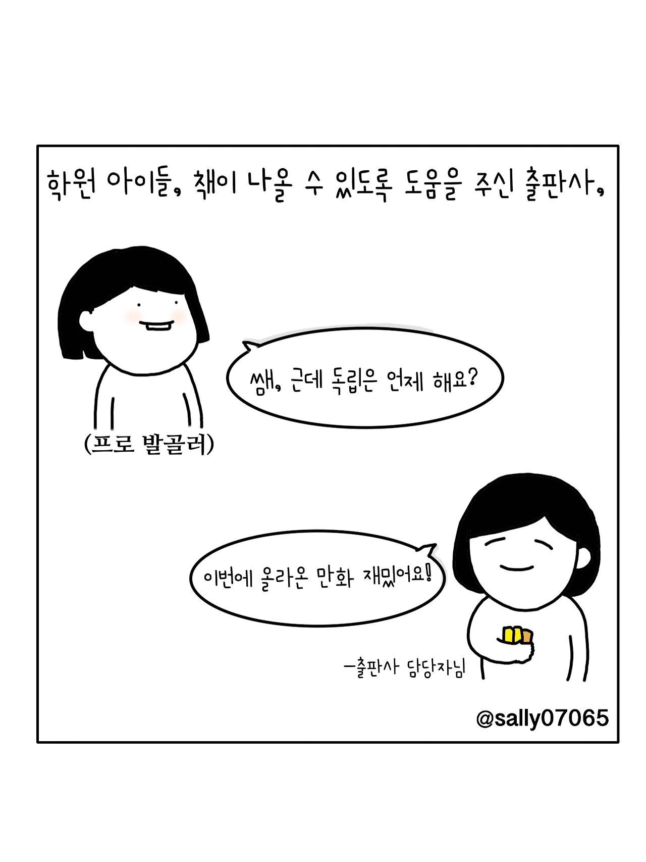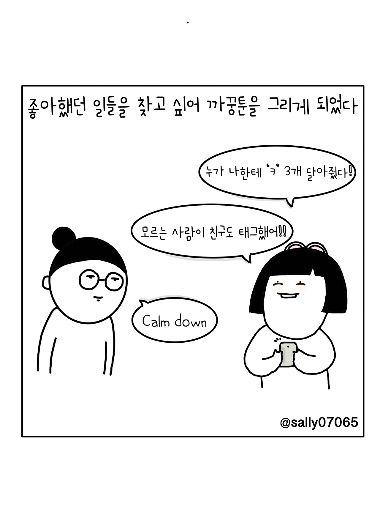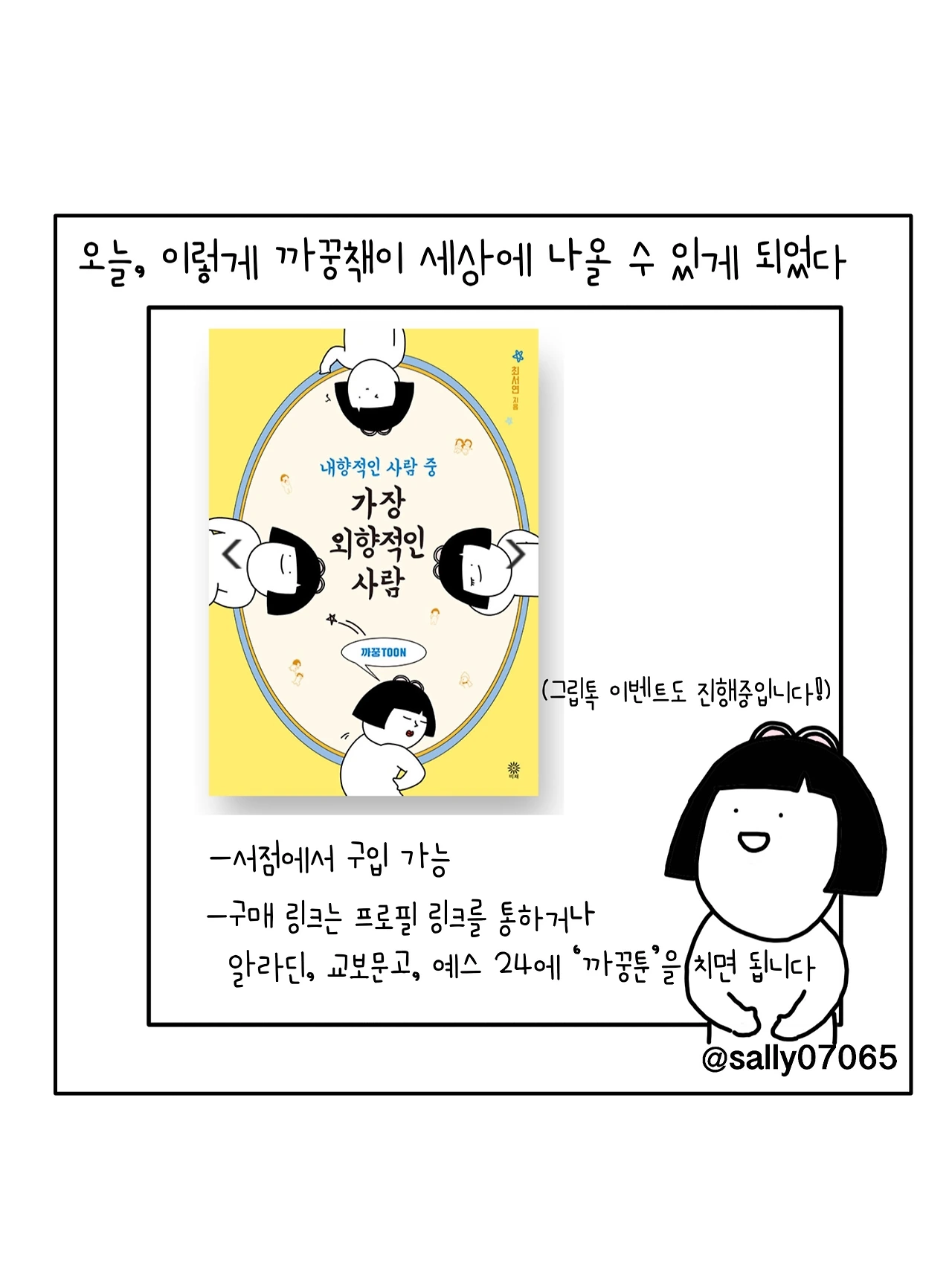 인스타계정sally07065에서 일상툰을 올리며, 블로그운영(밑 url 주소), 책 ‘내향적인 사람 중 가장 외향적인 사람’을 썼습니다