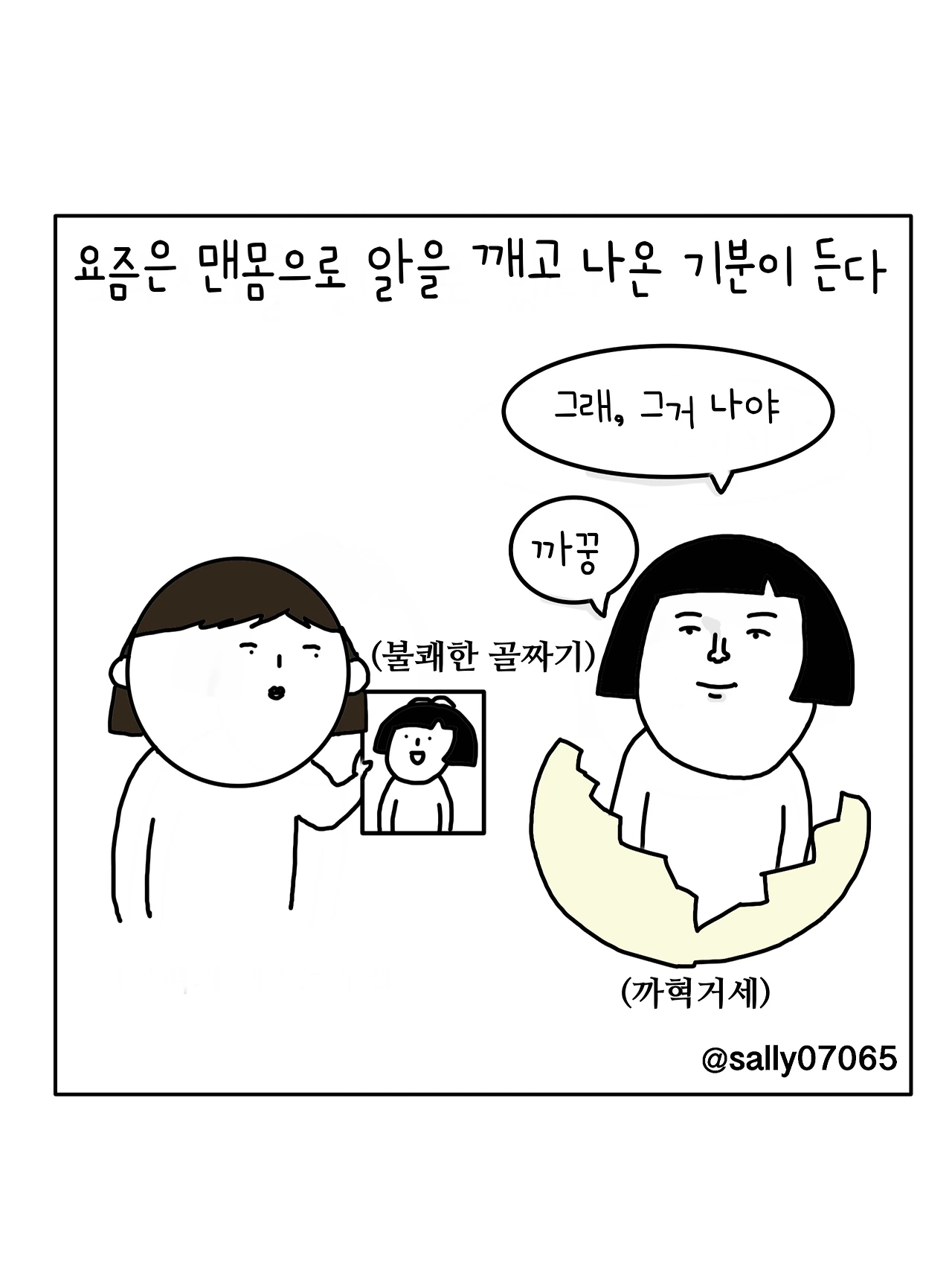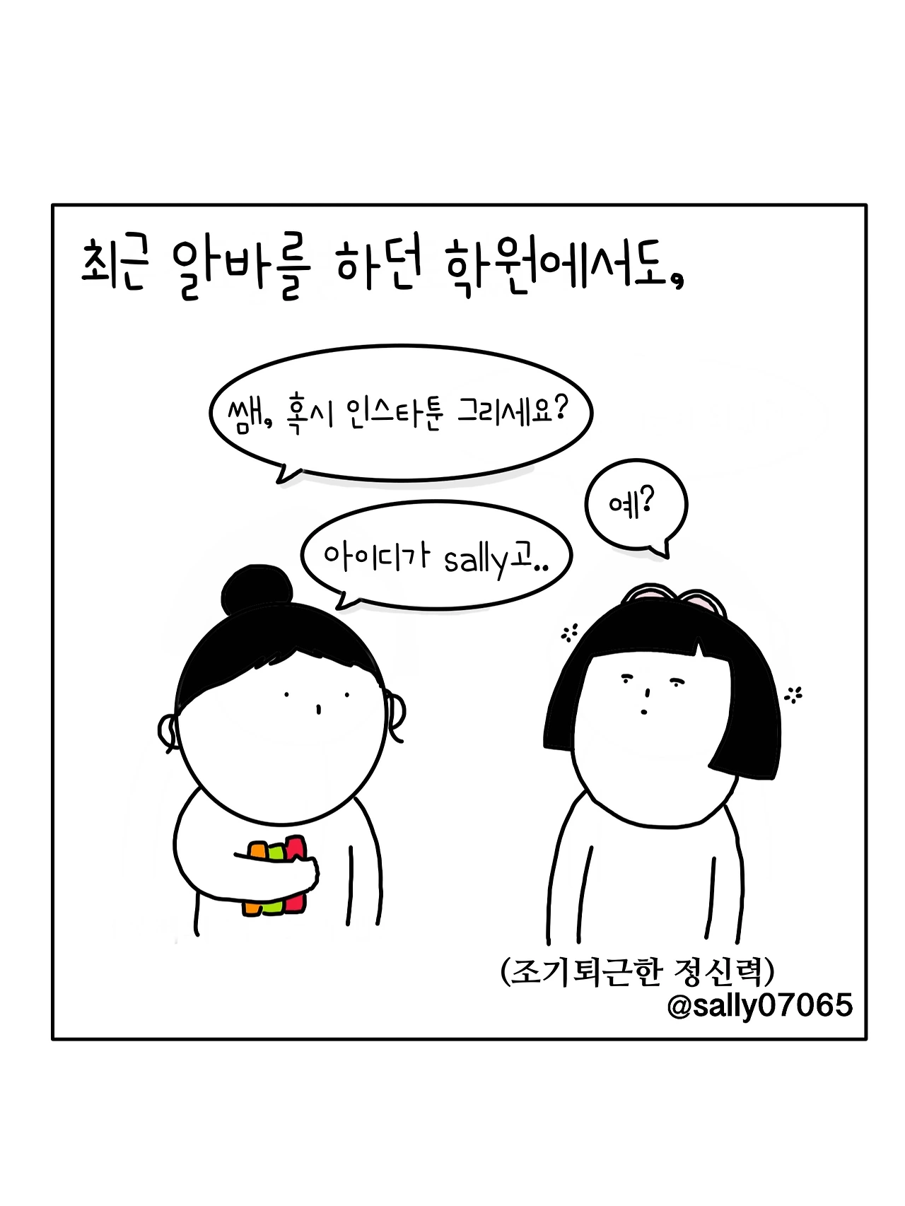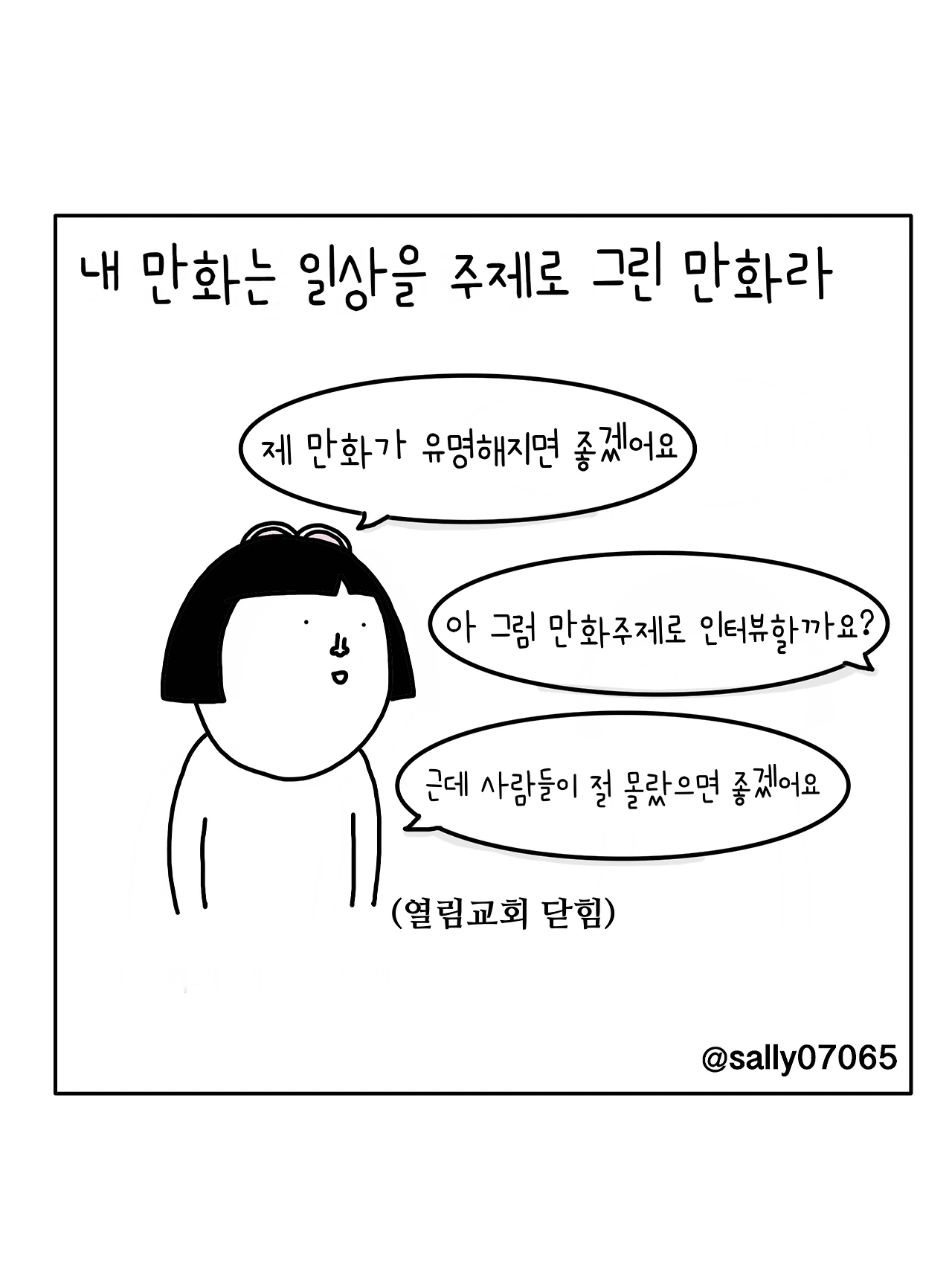 인스타계정sally07065에서 일상툰을 올리며, 블로그운영(밑 url 주소), 책 ‘내향적인 사람 중 가장 외향적인 사람’을 썼습니다