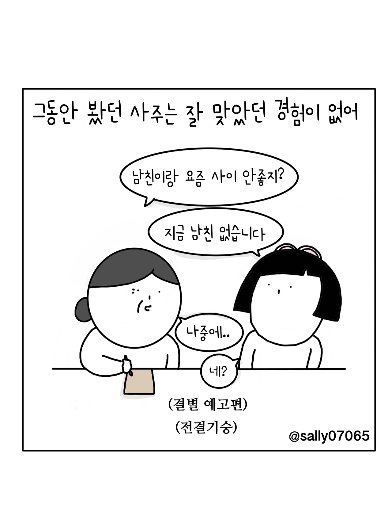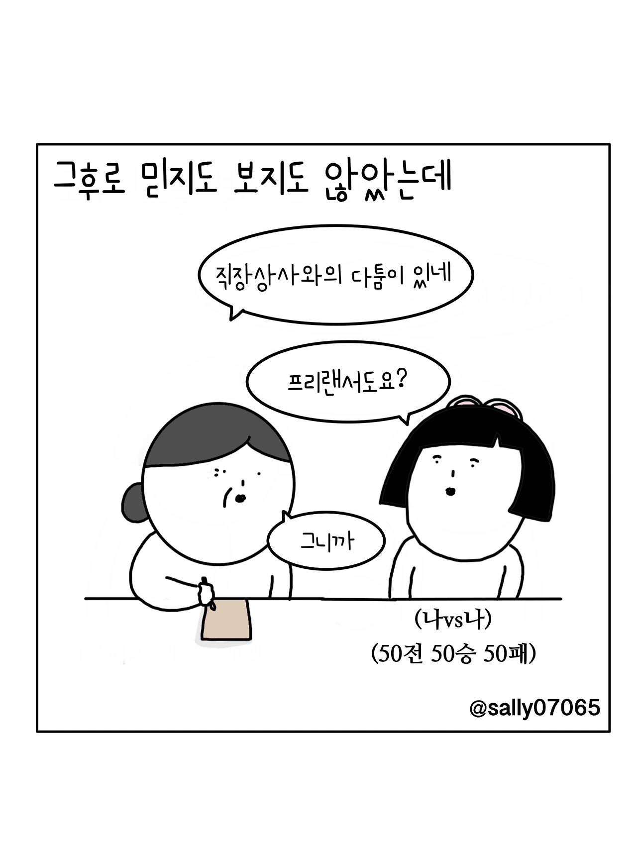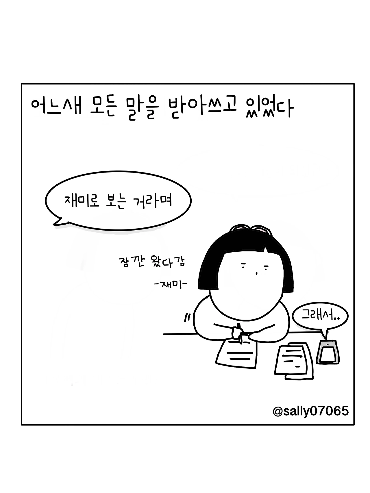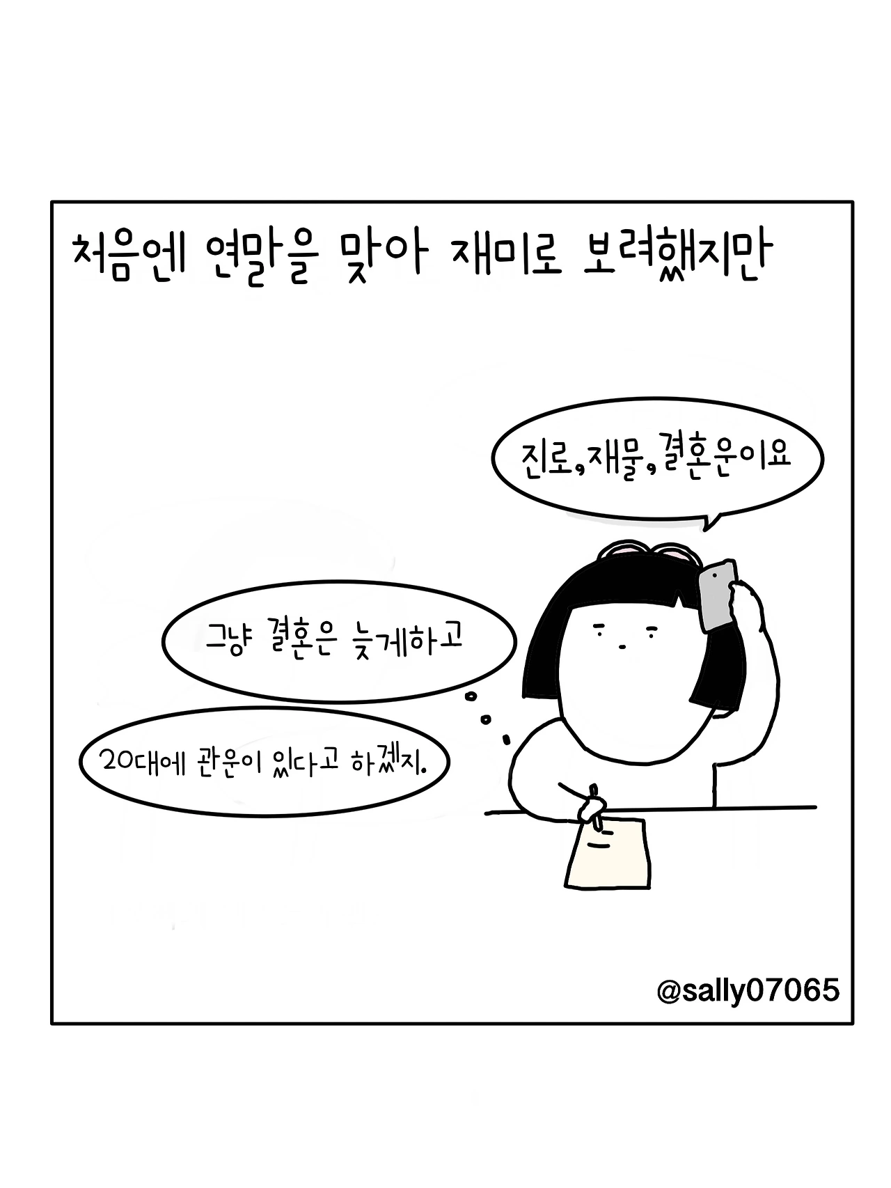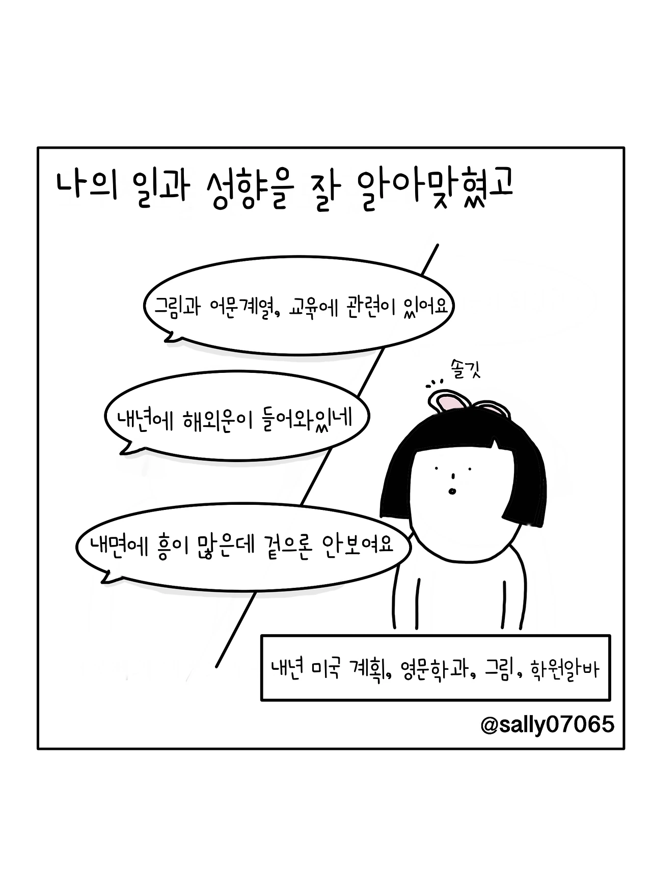 인스타계정sally07065에서 일상툰을 올리며, 블로그운영(밑 url 주소), 책 ‘내향적인 사람 중 가장 외향적인 사람’을 썼습니다