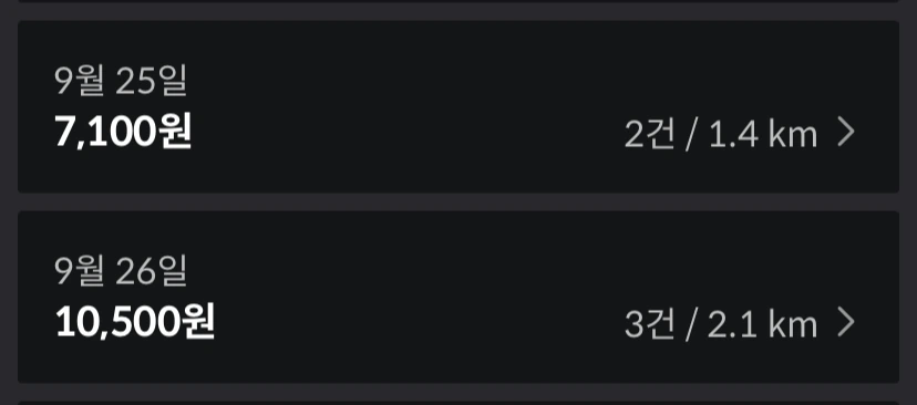 두근거리는 마음으로 첫 배달을 마친 심정은 너무나 뿌듯했다. 뭔가 열심히 세상을 살아가는 건실한 청년이 된 느낌이었다. 벅차오르고 청춘 드라마의 주인공이라도 된 듯 활기찼다. 그렇게 첫 배달의 뽕을 맞고 나는 연달아 다음 배달을 신청했다. 9월 25일 나의 첫 배민 커넥트 경험은 2건으로 7,100원을 기록했다. 그리고 다음날은 3건을 해서 10,500원을 벌었다.