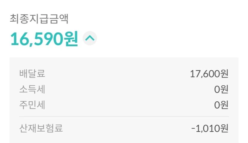 2일간의 수입은 17,600원으로 나쁘지 않은 경험이었다. 그래서 언제 입금되나 두근거리며 기다렸지만 슬픈 사실을 알아버렸다. 그건 산재보험료가 빠진 다는 것이었다.ㅠ 그래서 최종 지급 금액은 16,590원이 되었다.