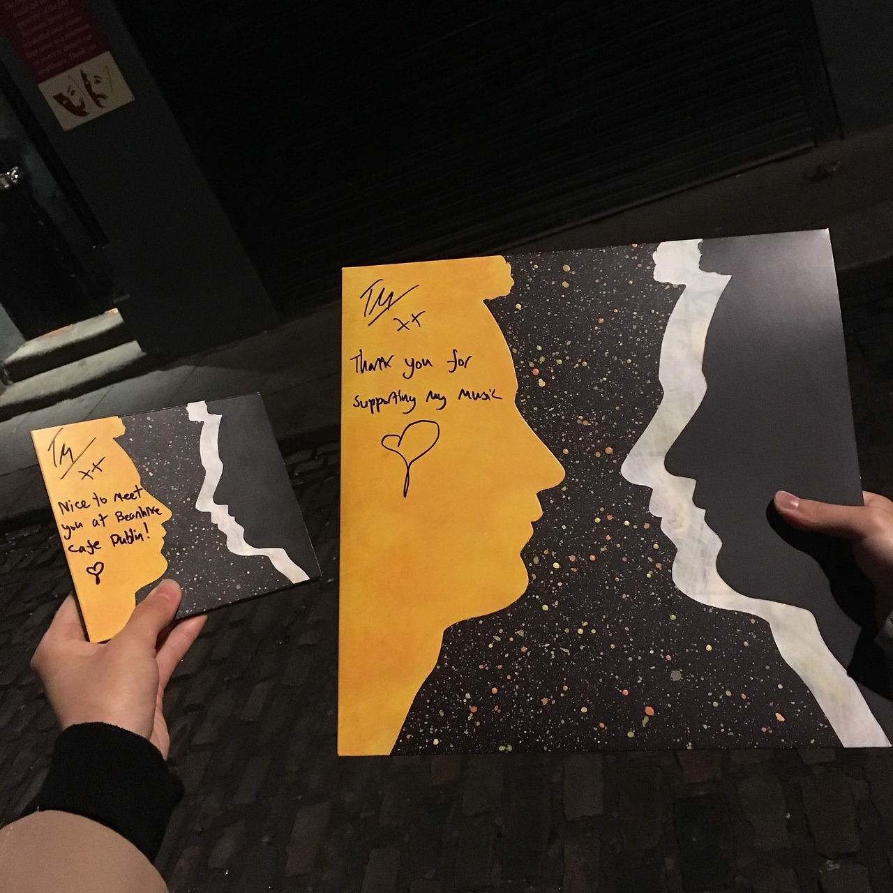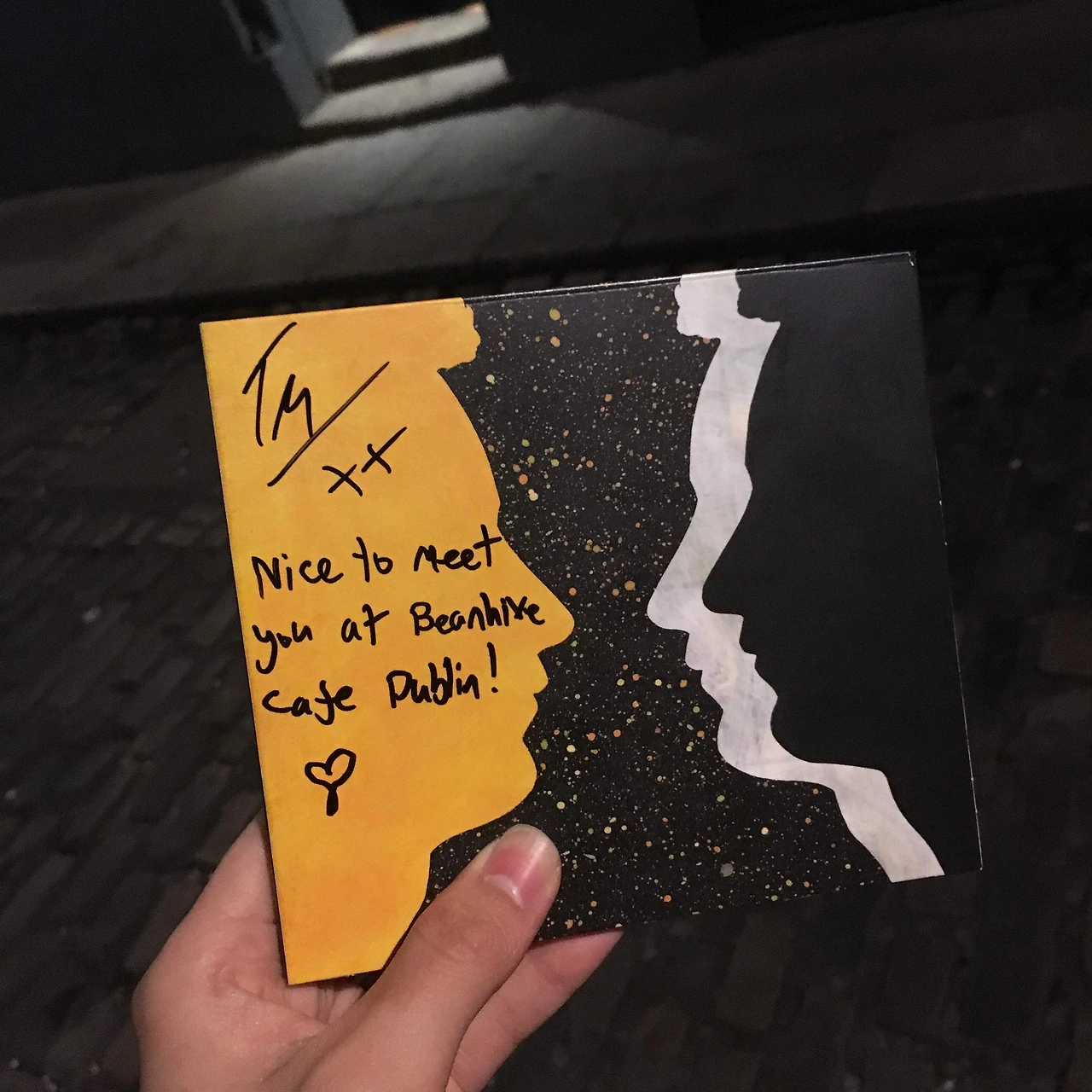공연이 끝나고, 오랜 기다림 끝에 톰에게 사인을 받을 수 있었다. 그가 오라고 말했던 장소를 찾지 못하고 이리저리 헤매며 오랜 시간 동안 공연장 밖에서 그를 기다렸다. 얼마쯤 기다렸을까. 다리가 아파오고 차가운 밤공기 덕에 몸이 으슬으슬 떨려오는 무렵, 우리를 본 공연 관계자분은 우리가 톰을 보러 더블린까지 왔다는 사실을 알고는 감사하게도 그에게 사인을 받아다 주셨다. 지금도 믿기지가 않는다. 그가 남긴 'Nice to meet you at Beanhive cafe Dublin!'와 함께 그려져 있는 귀여운 하트. 오늘은 도무지 말도 안 되는 하루구나, 하고 생각했다. 정말 세상 오래 살고 볼 일이라며.