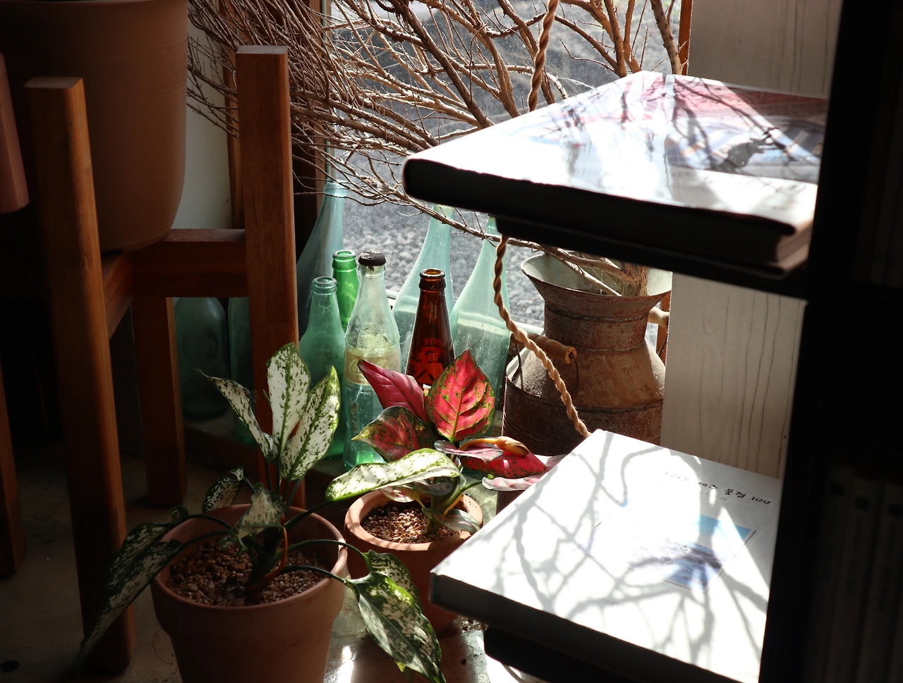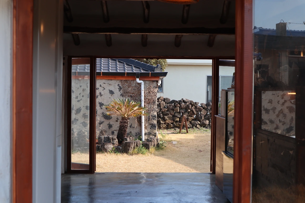 평대리 해변 근처 조용한 골목에 있는 카페는 가정집 3개가 연결된 형태였다. 한쪽은 독립서점으로, 나머지 공간은 카페로 이용되고 있었다. 돌담으로 둘러싸인 넓은 마당엔 주황색 그네도 있었고 그 너머론 푸른 바다가 보였다.