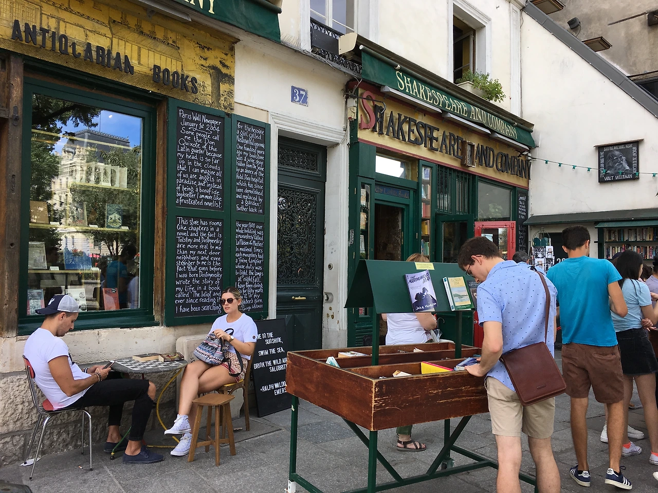 서점은 노트르담 성당 건너편에 위치해 있었다. 다리를 건너 골목 안쪽으로 들어오자 고풍스러운 진초록색 외관이 보인다.