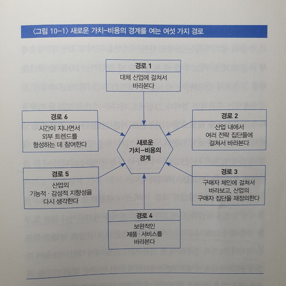 - 현재의 레드오션에서도 기회를 포착하고 새로운 가치-비용의 경계를 열 수 있도록 '여섯가지 경로 프레임워크'가 필요하다. 여섯가지 경로란 '산업, 전략 집단, 구매자의 집단, 제품/서비스의 범위, 제품/서비스 매력의 특징, 시간'이다.