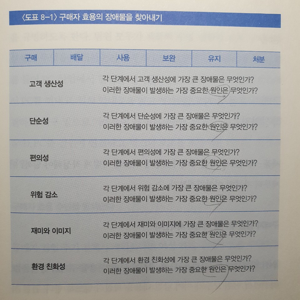 ② 여섯 가지 구매자 효용 수단(세로 축) : 대표적으로 '고객생산성, 단순성, 편의성, 위험감소, 재미와 이미지, 환경 친화성' 여섯 개의효용 수단을 통해 장애물을 찾아 낸다.