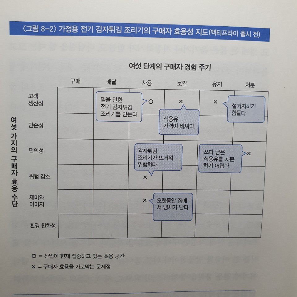 - 문제점이 드러나는 각 공간에 X 표시를 한다. 또한 업계가 현재 집중하고 있는 효용 공간에 O 표시를 한다.