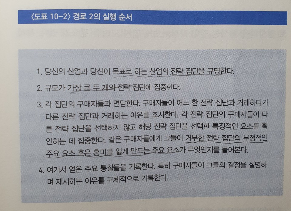 - 경로 1의 목표는 당신의 제품/서비스가 해결하고 있는 문제/요구가 무엇인지 확인하고 비고객이 같은 문제 해결/요구 충족을 위해 사용하는 다른 산업의 해결 방안들을 리스트화 하는 것이다.