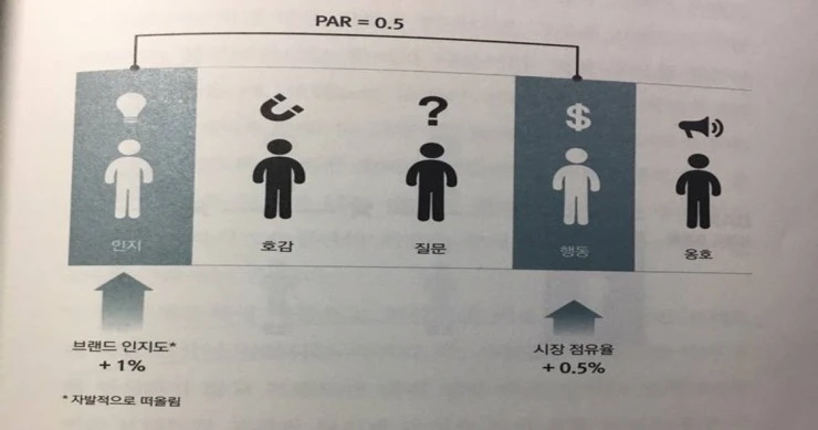 - 예시 : 모 브랜드가 브랜드 인지도를 1% 높이기 위해 더 많은 투자를 하고 있으먀, 브랜드의 PAR 점수가 0.5라면 브랜드에 대한 지출의 50%가 시장 점유율 확보과정에서 허비된다는 뜻이다.