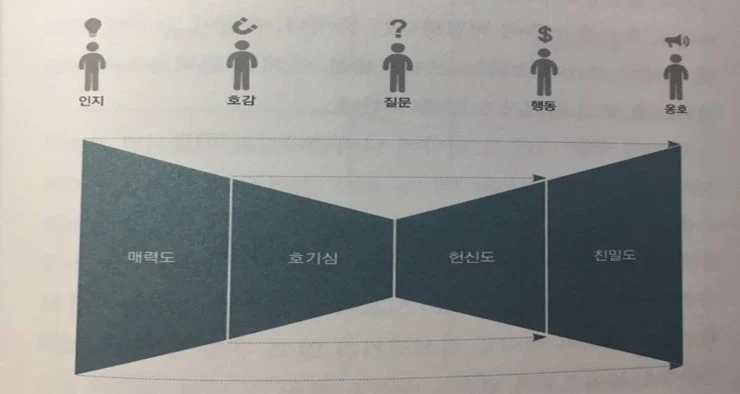 - '인지 → 호감 → 질문 → 행동 → 옹호'의 경로는 반드시 깔때기 모양이어야 하는 것은 아니며 모든 단계를 거쳐야만 하는 것도 아니다.