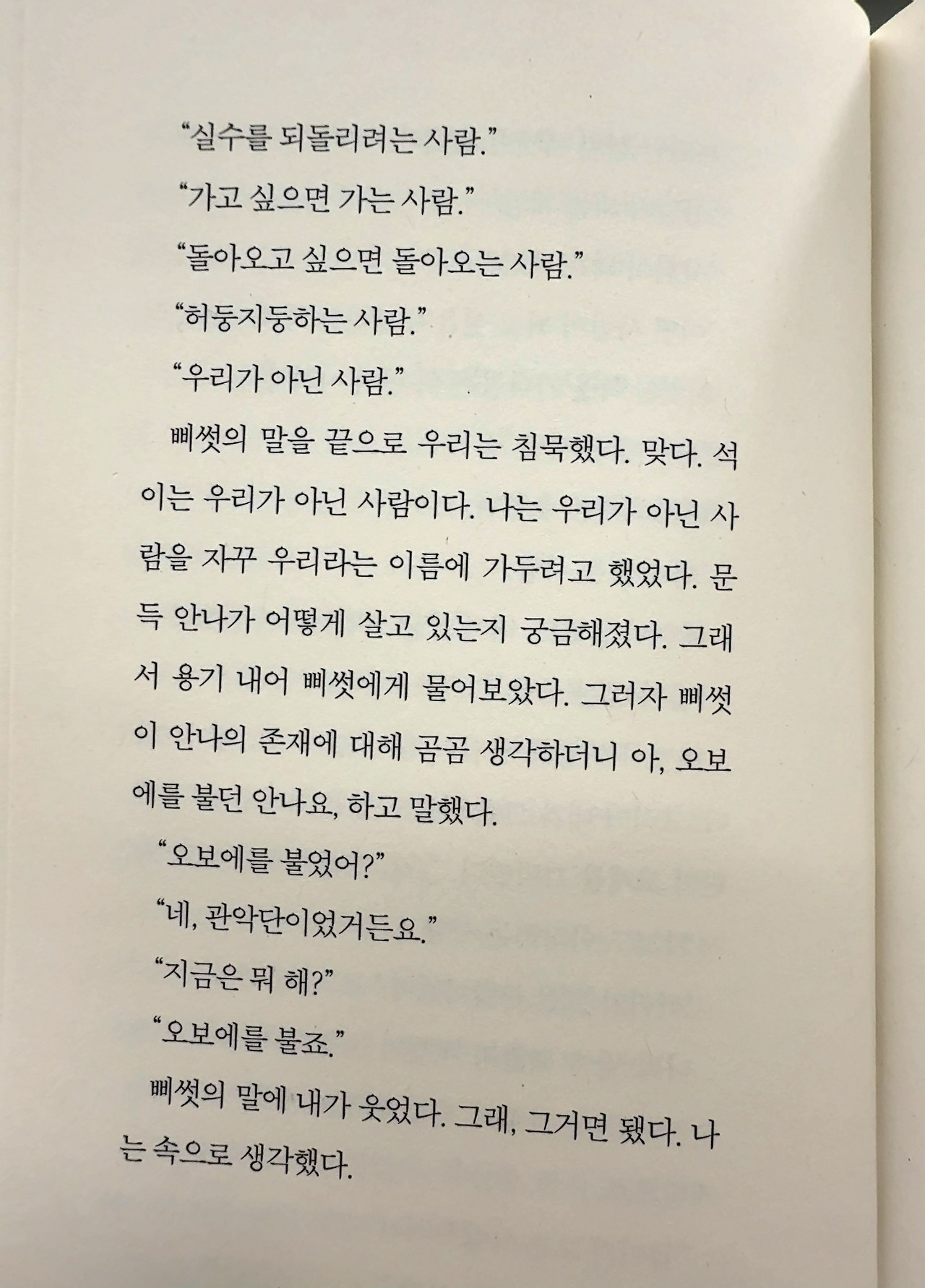 “…벙은 울고불고하면서도 이제는 행복해졌다고 했어요. 그런데 나는 그게 거짓말인 걸 단번에 알았어요. 행복한 사람은 그렇게 쉽게 행복하다고 하지 않거든요.” p.41