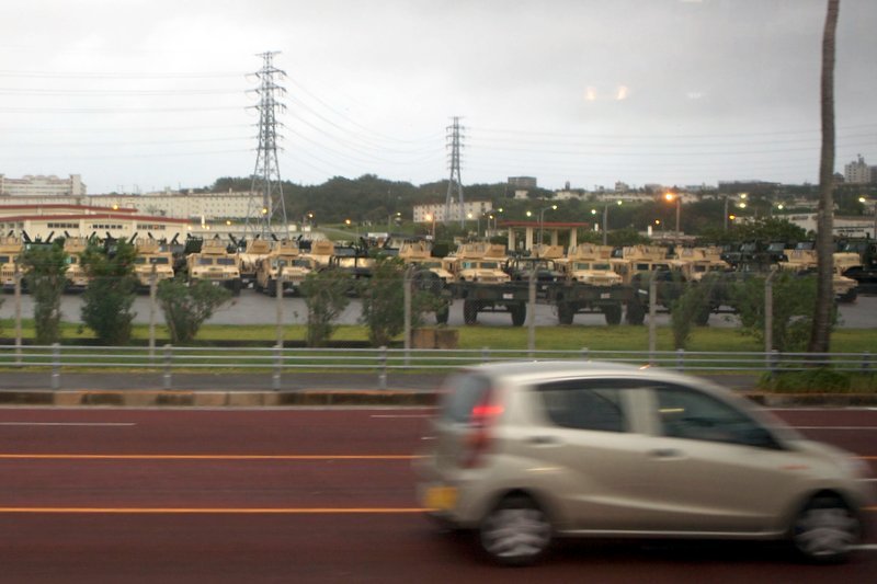 형주 잠깐 지나가다가 본 것도 아니었고 양 옆으로 몇 천 미터 동안 계속해서 기지가 이어졌어요. 어마어마한 규모죠. 그것뿐만 아니라 오키나와 공항은 활주로를 내려올 때 ‘해상자위대’라고 적힌 격납고들과 전투기들이 보였어요. 전세계 모든 공항이 군사기지로서의 역할도 겸하고 있을텐데, 오키나와는 그 모습이 완벽하게 전면에 내세워져 있어요. 그래서 내릴 때부터 군용 수송기와 헬기들을 보면서 시선을 빼앗겼죠.