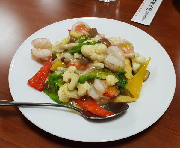 형주 뚝배기에 끓고 있는 마파두부와 싱싱한 야채, 새우가 들어간 해산물 야채 볶음을 시켜서 먹었어요. 가게 이름이 조금 특이했어요.