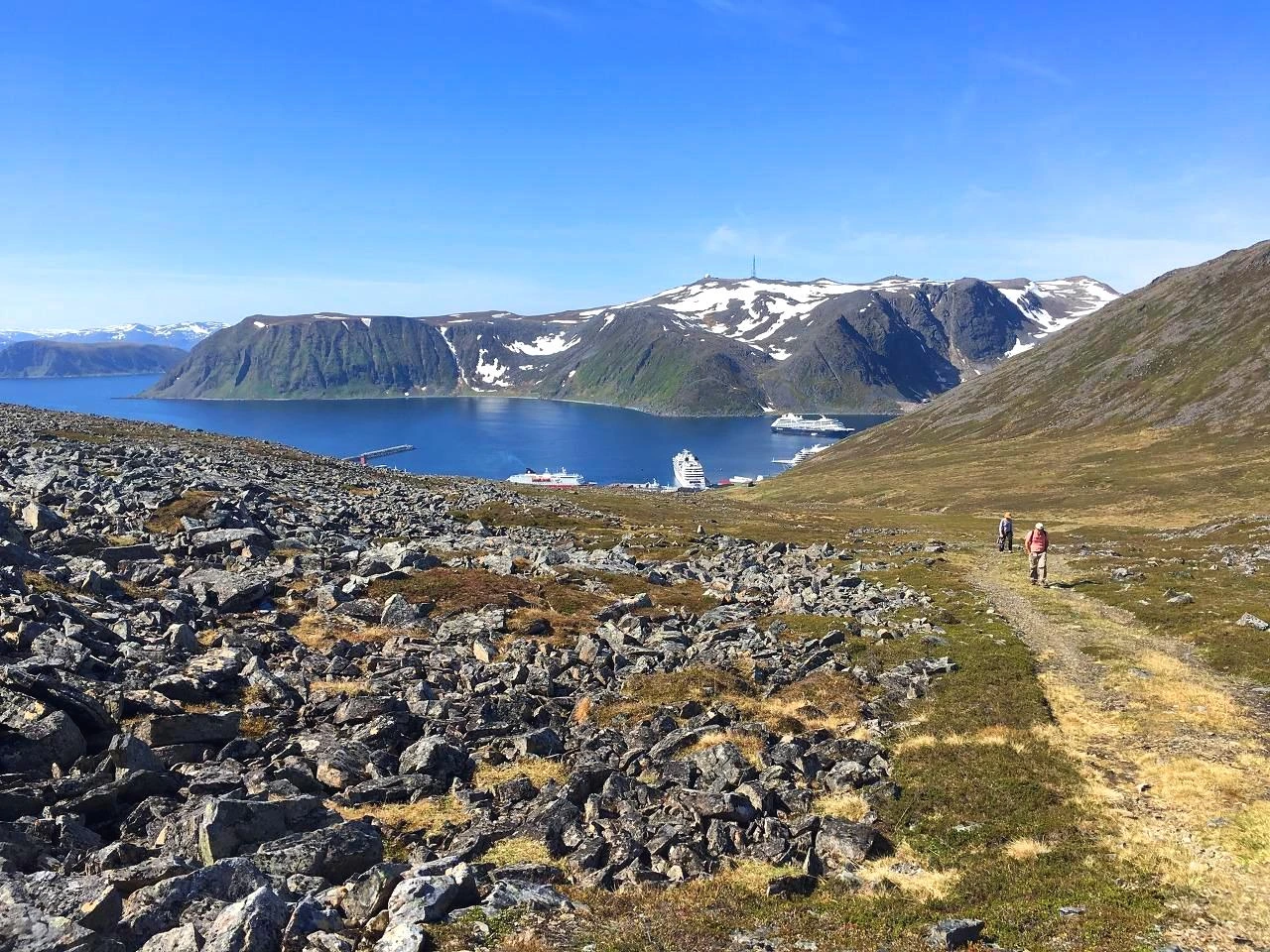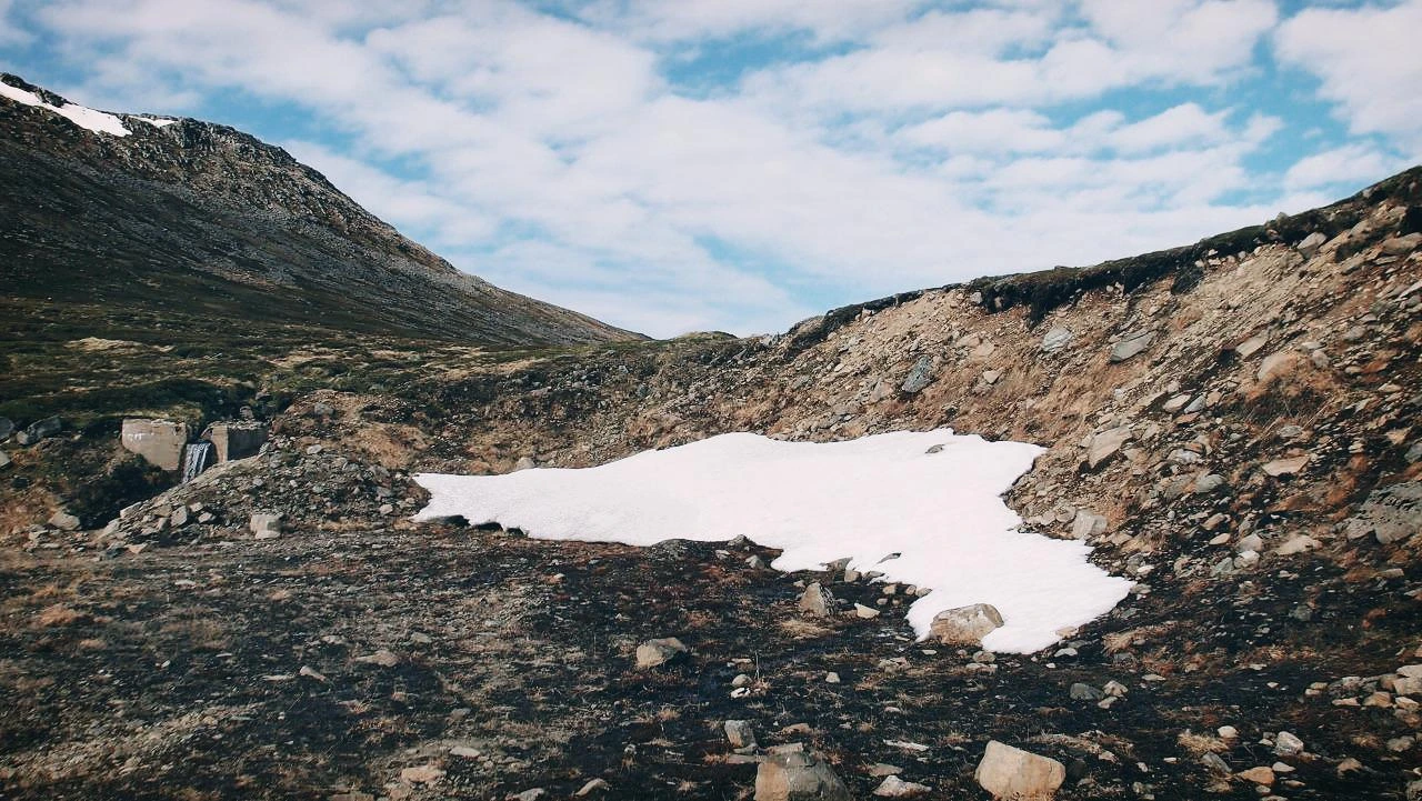 정말 돌투성이의 길에 풀은 이끼밖에 없고, 6월말임에도 불구하고 여기저기에 만년설이 남아 있었다. 이것이야 말로 이국적인 풍경이며 대자연을 느끼는 것이 아닌가. 나는 왜 남미등을 포기하고 이 먼 북극의 동토까지 왔는지에 대한 일말의 후회를 계속 하고 있었는데, 그 모든 후회를 날려버리는 멋진 풍경이었다. 판타지에서 보는 머나먼 여정의 시작같기도 하고.