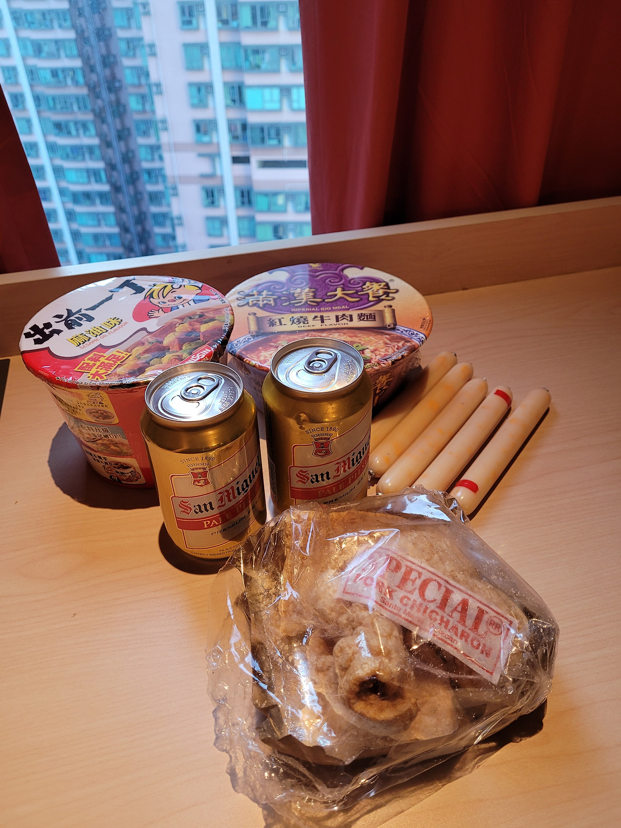 편의점에서 구해온 보물들. 거기에 집에서 출발하기 전에 출출할 때 먹으라며 아줌마가 챙겨준 치차론도 함께.