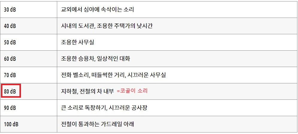 한편, 코골이 소음은 보통 50~70dB 정도로, 심한 경우 80dB까지 나올 수 있다고 한다. 이는 지하철 소음과 비슷한 수준이며, 야간 기준인 34dB을 훨씬 웃돈다.