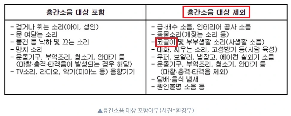 먼저 환경부 자료를 찾아보니, 코골이는 층간소음 대상에 포함되지 않는다고 한다. 민원인에겐 안타까운 일이다.