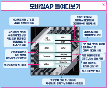 모바일 AP에는 CPU, 메모리, 그래픽카드, 저장장치 등 한 개의 칩에 완전 구동이 가능한 제품과 시스템이 들어 있어 시스템 온칩 SoC(System on Chip)이라 불립니다.