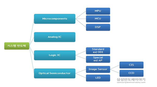 시스템 반도체는 통상 마이크로 컴포넌츠(Microcomponents), 아날로그 IC(Analog IC), 로직 IC(Logic IC), 광학 반도체(Optical Semiconductor) 등으로 구분됩니다.