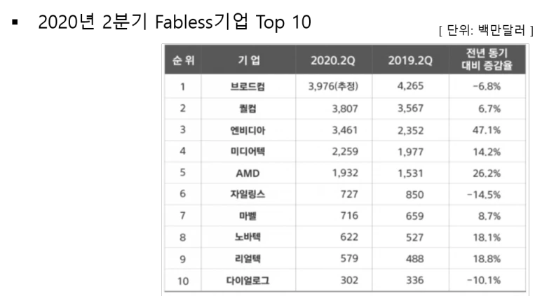 아래표는 작년 2분기 팹리스 기업 매출 순위입니다.
