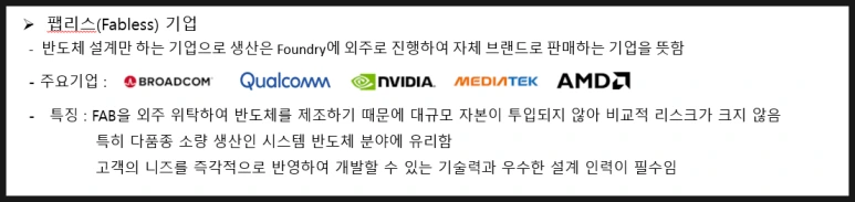 FAB 즉 반도체 생산공장은 없이 반도체 설계만 하는 기업으로 생산은 Foundry에 외주로 진행하여 자체 브랜드로 판매하는 기업을 뜻해서 Fabless기업이라고 합니다.