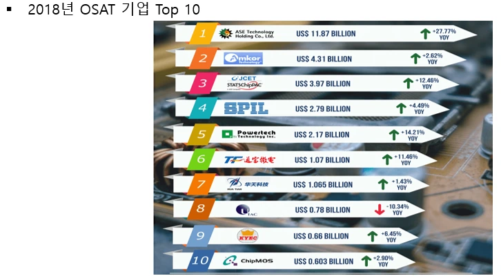 대만에 OSAT기업이 많은 이유도 TSMC, UMC 등 파운드리 기업이 성장함에 따라 OSAT기업들도 같이 성장했기 때문입니다.
