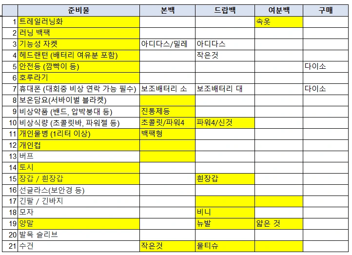 혹시 몰라 준비물 목록을 공유한다. 노란색은 당일 아침 입고 가거나 휴대할 물품 목록들이다.