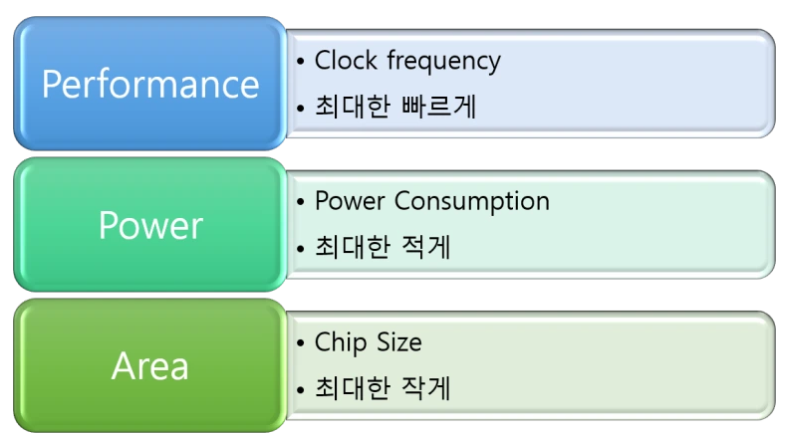 PPA는 Performance(성능), Power(전력), Area(면적)의 약자로 쉽게 말해서 성능은 좋아야 하고 전력은 적게 먹어야 하는데 사이즈는 작게 만들어야 한다는 뜻이다.