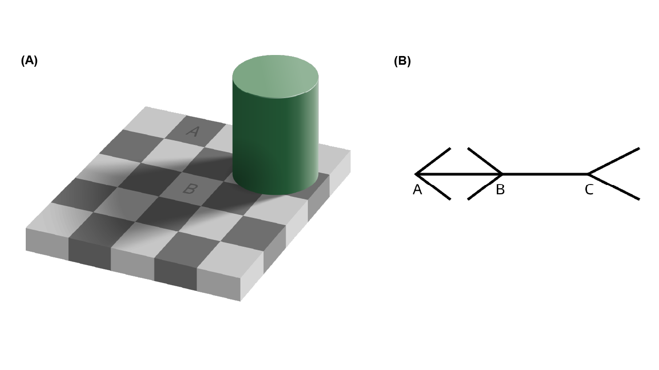 예를 들어, 아래 (A) 체커 그림자 착시에서는 사각형 A와 B가 실제로 같은 밝기임에도, 원통의 그림자라는 맥락 때문에 B가 더 밝게 보인다.