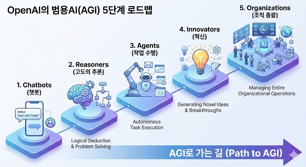 1단계는 챗봇, 2단계는 고도의 추론이 가능한 추론자(Reasoners), 3단계는 인간을 대신해 작업을 수행하는 에이전트(Agents), 4단계는 새로운 아이디어로 혁신을 돕는 혁신자(Innovators), 마지막 5단계는 홀로 조직 단위의 업무까지 총괄하는 조직(Organizations)이다.