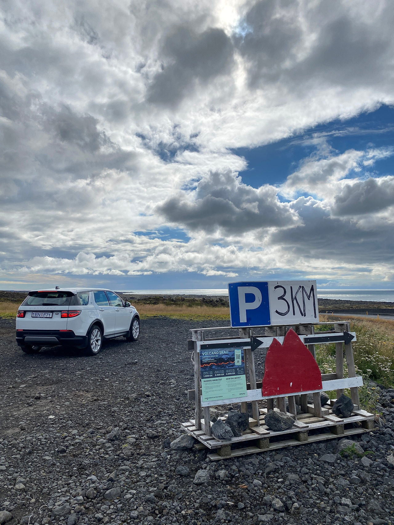 목적지에 도착하니 빨간 화산이 그려져 있고 3km라고 쓰여있다. 이상하다. 여기서 다시 화살표 방향으로 3km를 더 가야 주차장이 나온다는 표시였다. 나중에 확인해 보니 처음 찾은 주차장은 지난해 용암이 분출했을 때 활용된 주차장이었던 것이었던 것이었다....